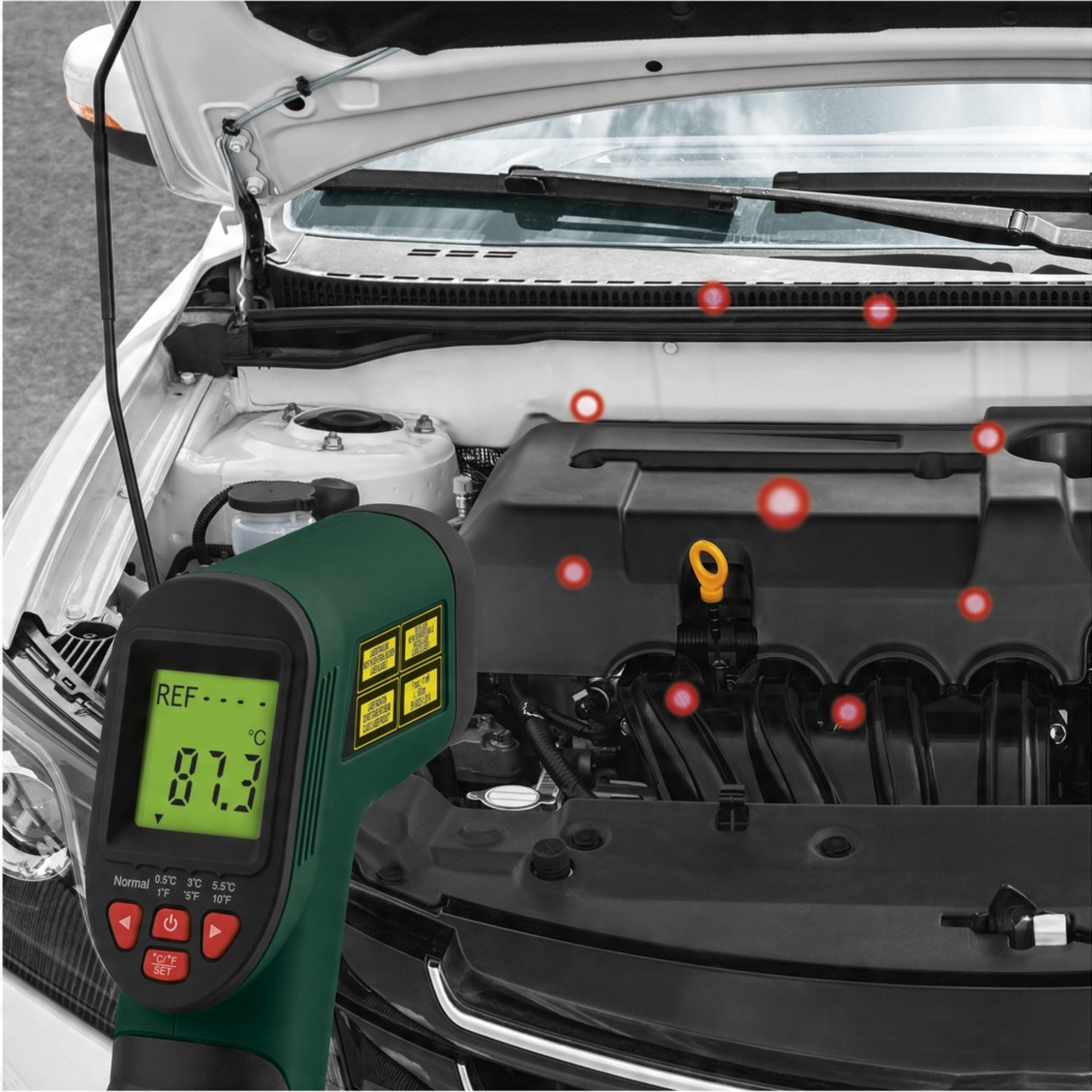 - Лазерный указатель – облегчает точное определение места измерения температуры.