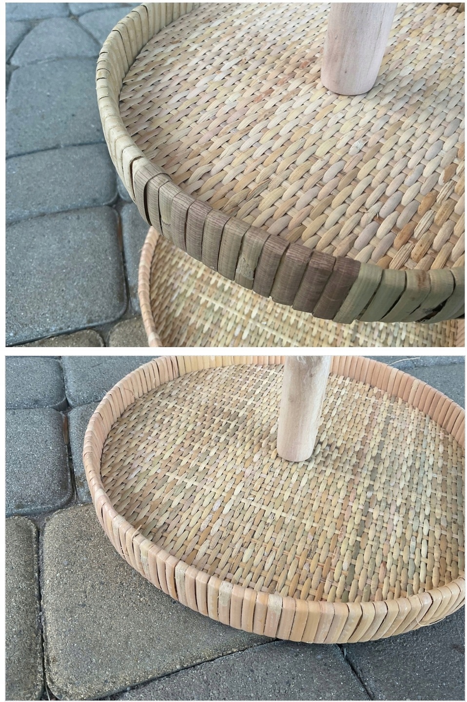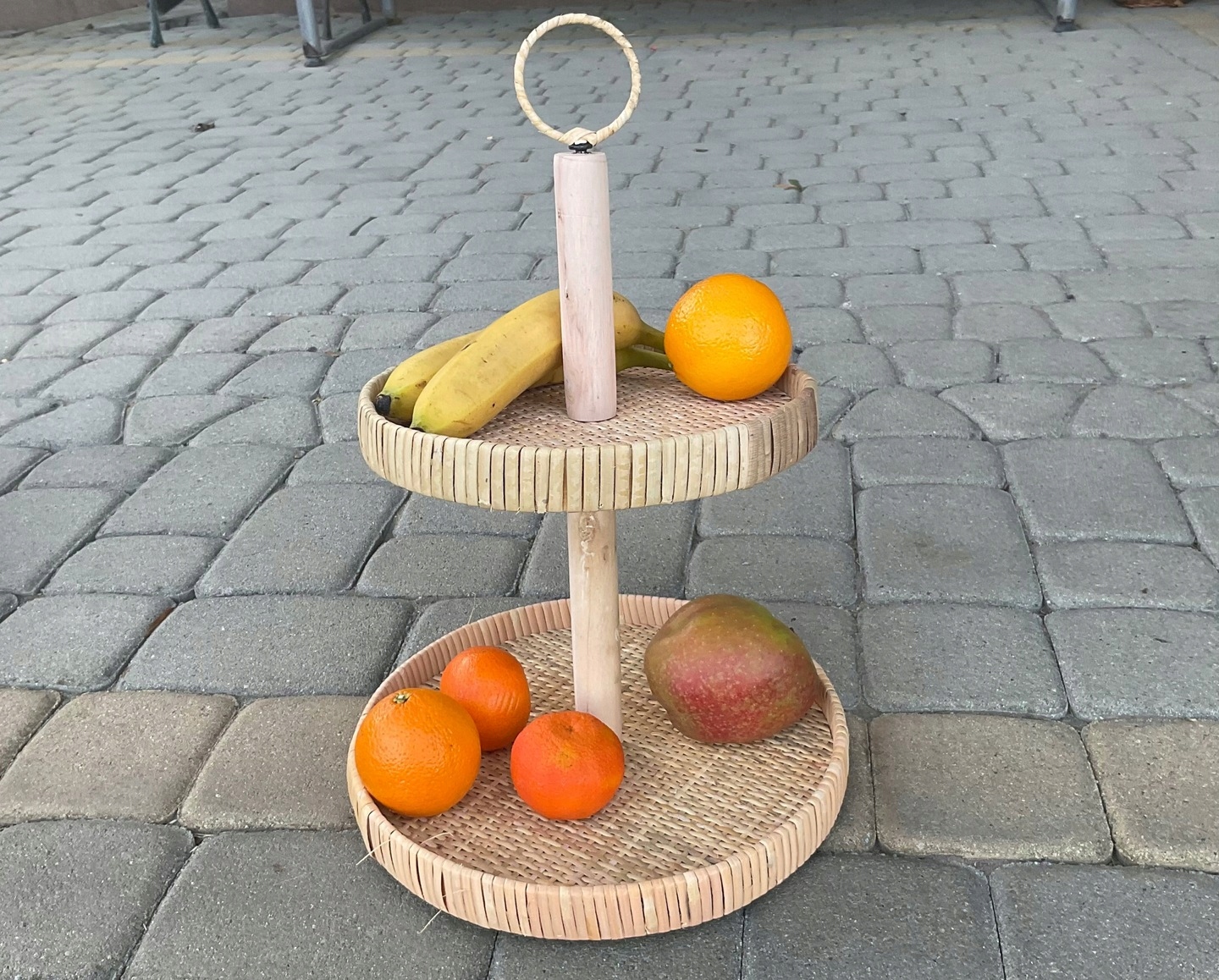 Ратан заплатил пасть о металлическом раме. Пластины с диаметром 27,5 см нижнего и 24,5 см верхний идеален как сосуд для представления и подачи фруктов, орехов, сухих закусок, кексов и т. Д.