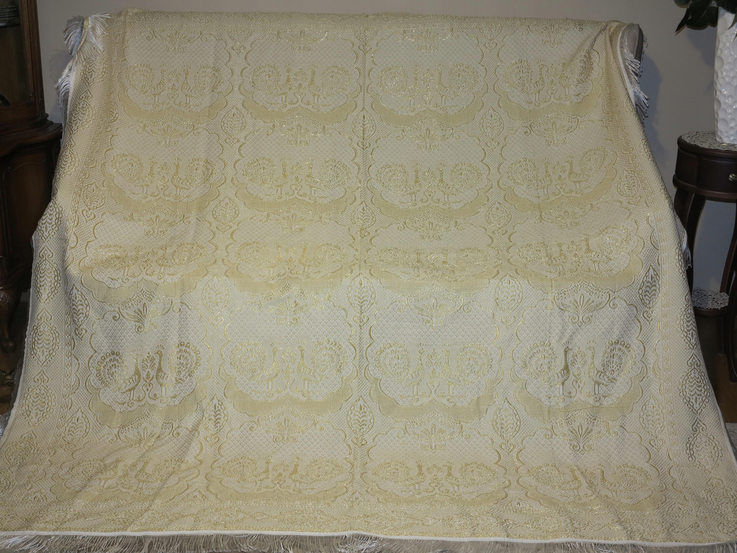 Предмет аукциона – красивое структурное покрывало с выпуклыми узорами в виде павлинов. Имеет размеры: 214/201 см плюс 7 бахромы. Б/у, в отличном состоянии. Рекомендую
