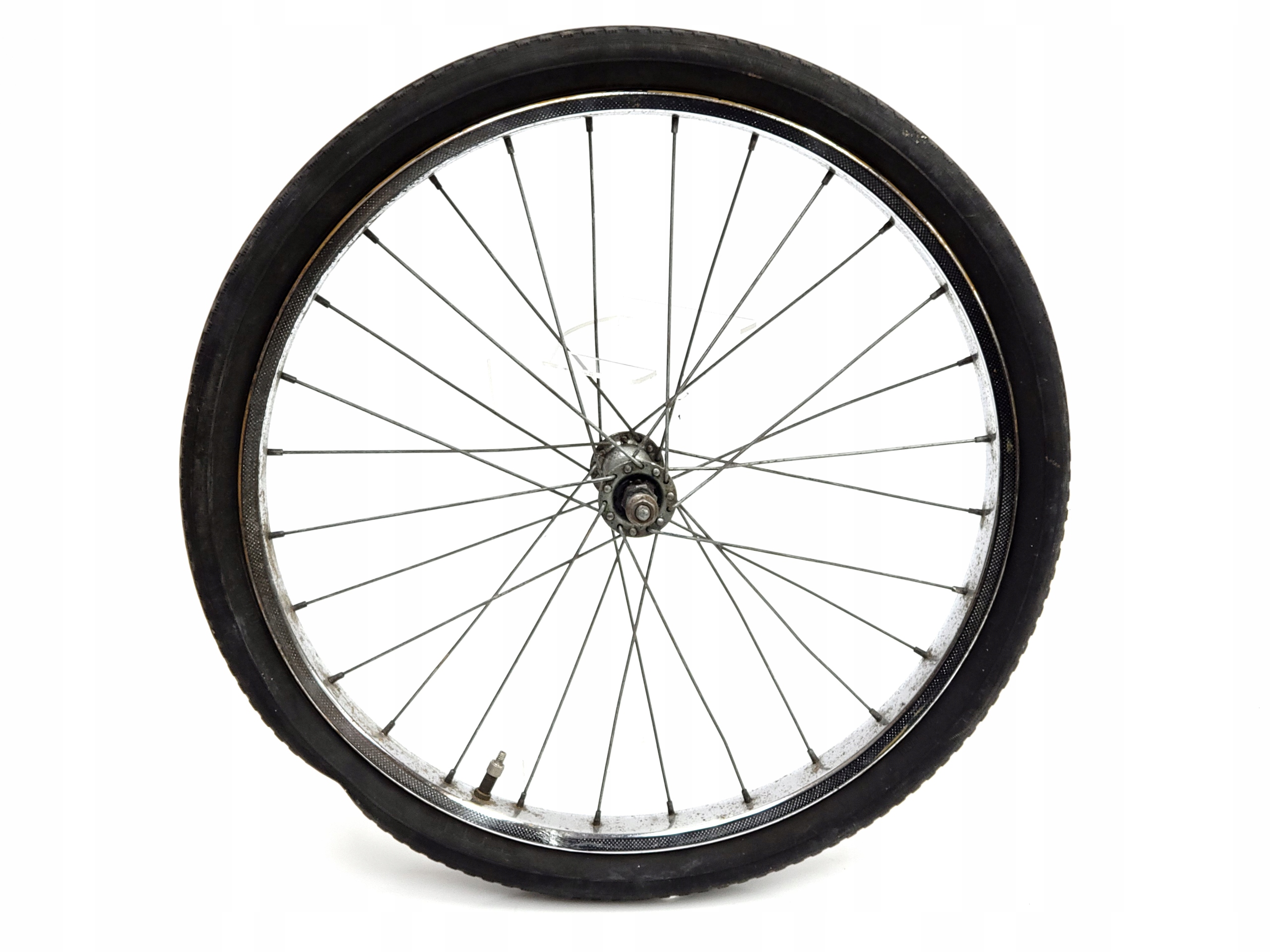 Мы предлагаем 20 -килограммовое переднее колесо (внешний диаметр обода: 42,5 см) для Romet Wigry Bicycles Sokół Flaming Karat и аналогичные модели с годов PRL. Простой обод, но с коррозией, острой осью - для регулировки, шины с 1993 года, вы можете увидеть трещины, но для дальнейшего использования внутренняя трубка свободна, но не была проверена.