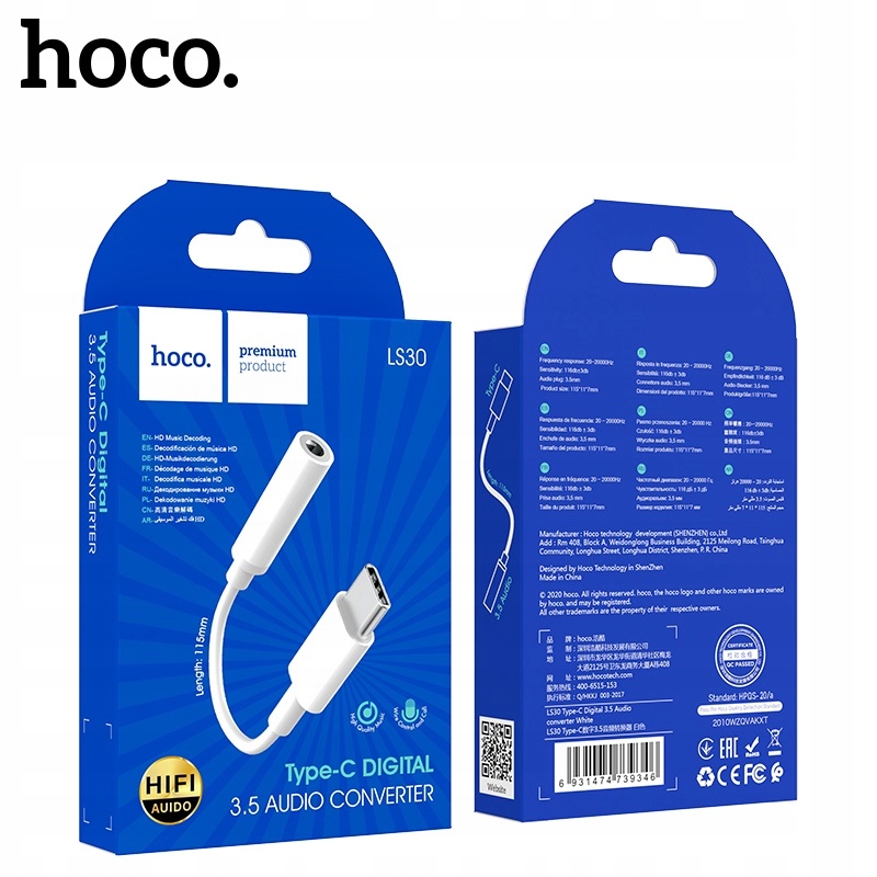 hoco. LS30 Type-C Digital — цифровой аудиоадаптер/конвертер/переходник с разъемом AUX Jack 3,5 мм и USB Type-C, предназначенный для подключения кабельных наушников любого типа с разъемом Audio Jack 3,5 мм, с поддержкой микрофон и пульт с управлением музыкой и звонками на мобильные устройства без разъема для наушников.