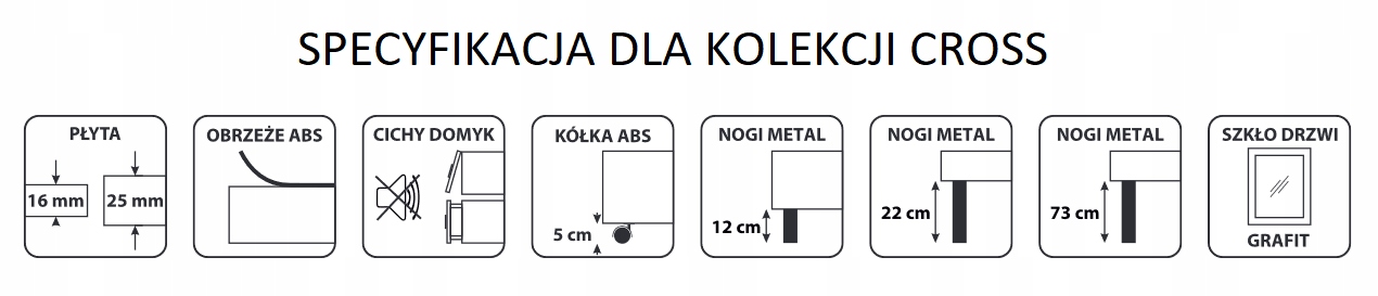 Cross Collection - идеальное решение для гостиной или спальни. Мебель даст современный вид всего расположения, а простая и оригинальная форма будет найдена во многих интерьерах. Серия Cross имеет минималистские ручки, которые соответствуют ногам. Цвет черного в сочетании с белыми матовыми фронтами создает когерентное целое, что, безусловно, привлекает внимание. Мебель очень вместительна и функциональна. Коллекция оснащена тихой системой закрытия, пластины закреплены с краем ABS. Ноги сделаны из металла.