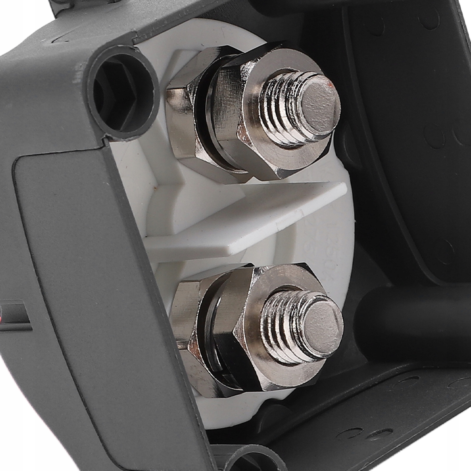 3. Удобная установка: Выключатель аккумуляторной батареи для тяжелых условий эксплуатации оснащен штифтом 2x10 мм (3/8 дюйма) и четырьмя съемными боковыми пластинами, которые обеспечивают доступ к кабелям размером до 1/0.