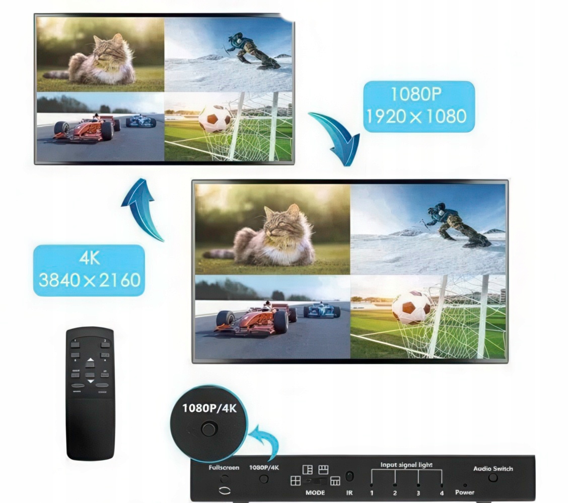 HDMI Multiviewer 4x1 - это универсальный переключатель , который позволяет отображать сигнал из 4 источников HDMI на одном экране .