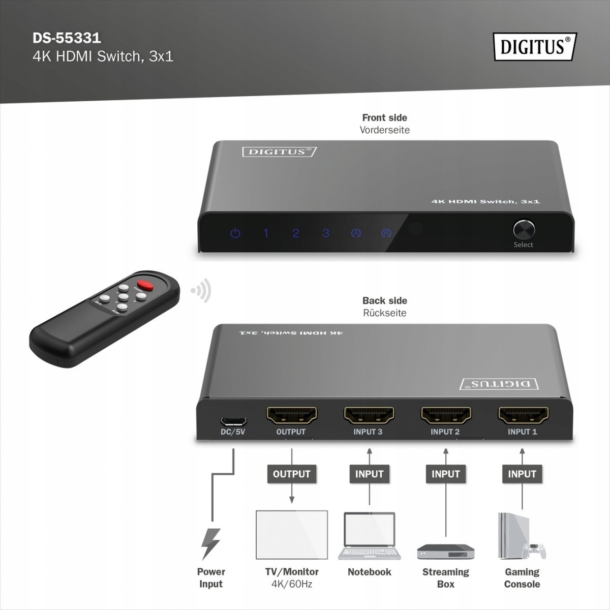HDMI 4K -переключатель Digitus Type 3 x 1 предлагает дополнительные разъемы HDMI для отображения дисплея - вы можете отобразить 3 источника сигнала, используя только 1 разъем HDMI. Видео -переключатель питается на кабеле Micro USB, например, через исходное устройство или источник питания USB. Можно удобно переключаться между источниками сигнала, используя пульт дистанционного управления или с автоматическим обнаружением. Он идеально подходит для установки телевизора на стене - все, что вам нужно, это кабель HDMI для подключения источников сигналов.