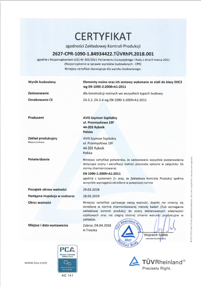 Повышая качество предлагаемой продукции, наша компания успешно прошла процедуру сертификации по стандарту PN-EN 1090, устанавливающему стандарты в области производства, в том числе. стальные конструкции. Сертификацию в этой области провел лидер рынка сертификационных и исследовательских услуг в Польше – TÜV Rheinland.