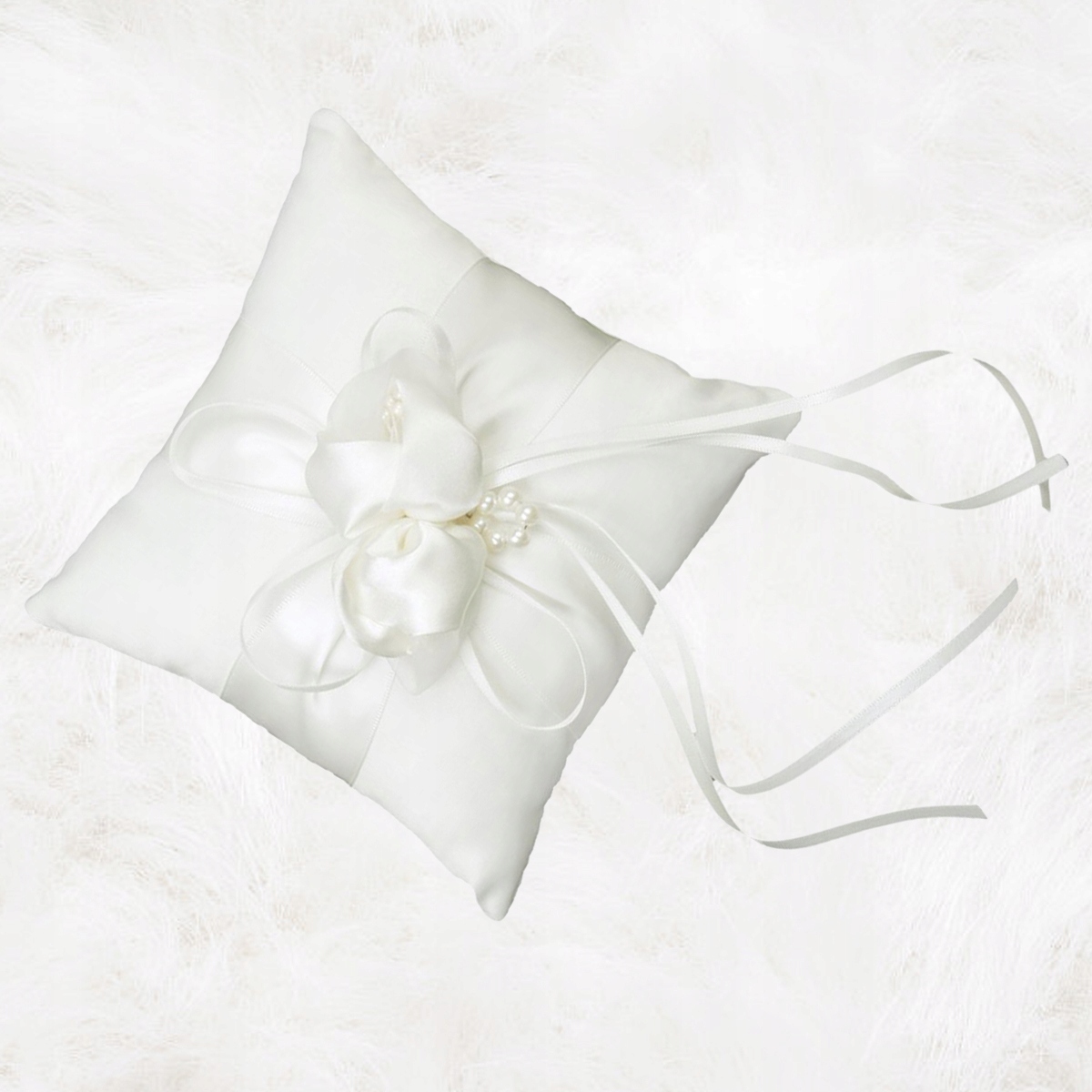 Белая подушечка для колец, украшенная атласными лентами и цветочной пряжкой для завязывания кольца.