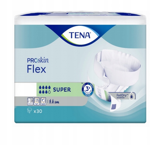 Tena Proskin Flex Super — это хорошо впитывающие подгузники с фиксирующим ремнем для людей с недержанием мочи, предназначенные для людей с тяжелым недержанием