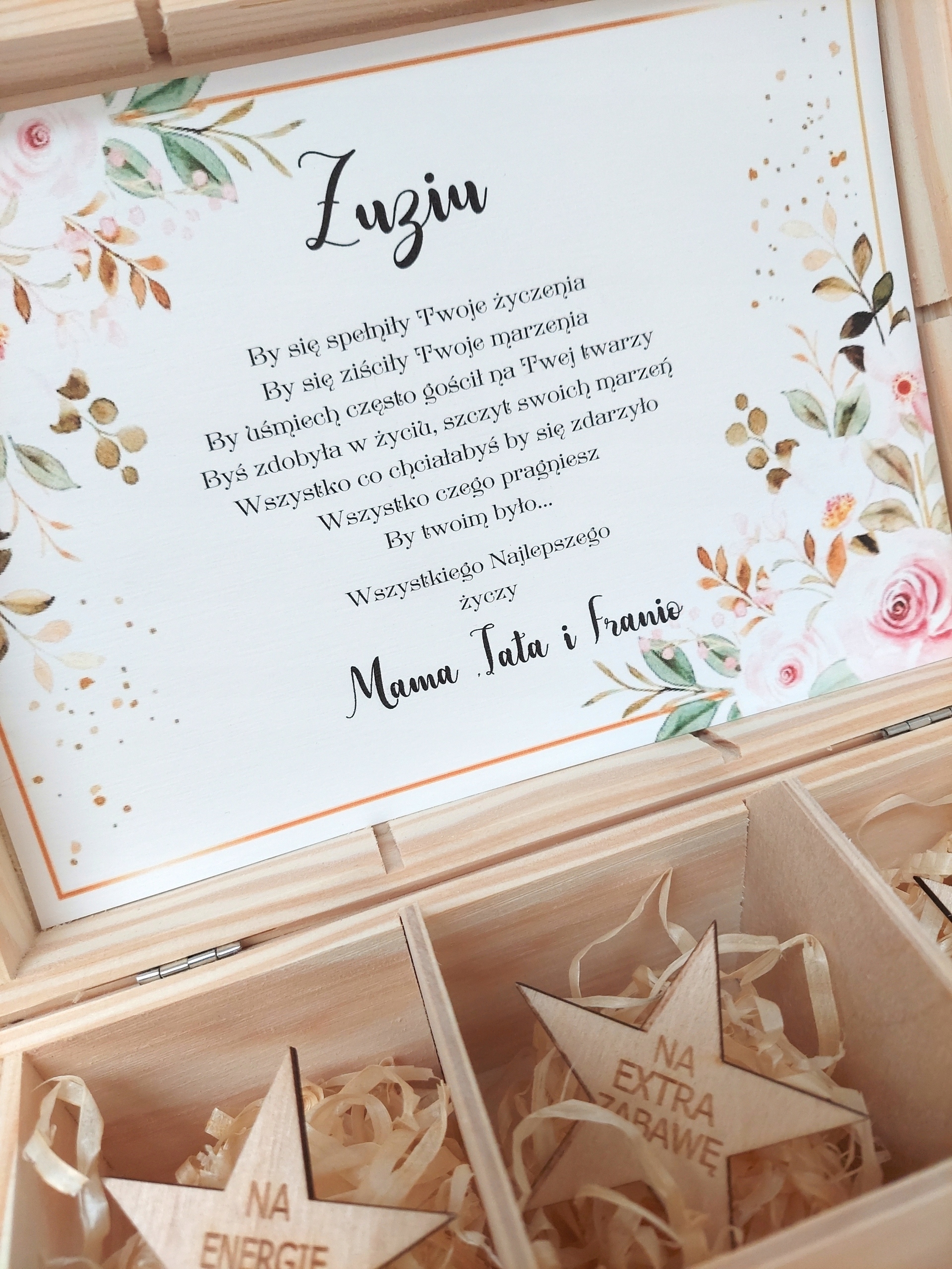 - с 6 отделениями внутри и деревянными звездочками с надписями