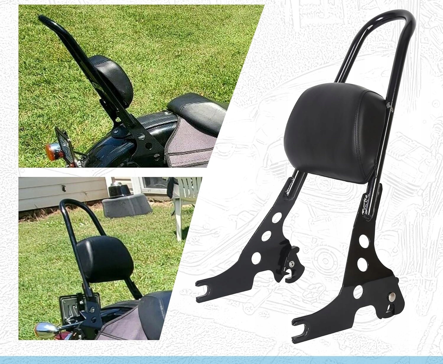 - Особенность: Sissy Bar с амортизационной подушкой изготовлен из прочной стали и устойчивой к искусственной коже. Это делает Sissy Bar сильным и длительным в трудном вождении. Нелегко сломать и легко чистить