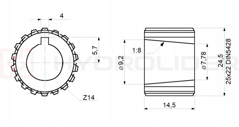 - Размер роликового конуса: 1: 8