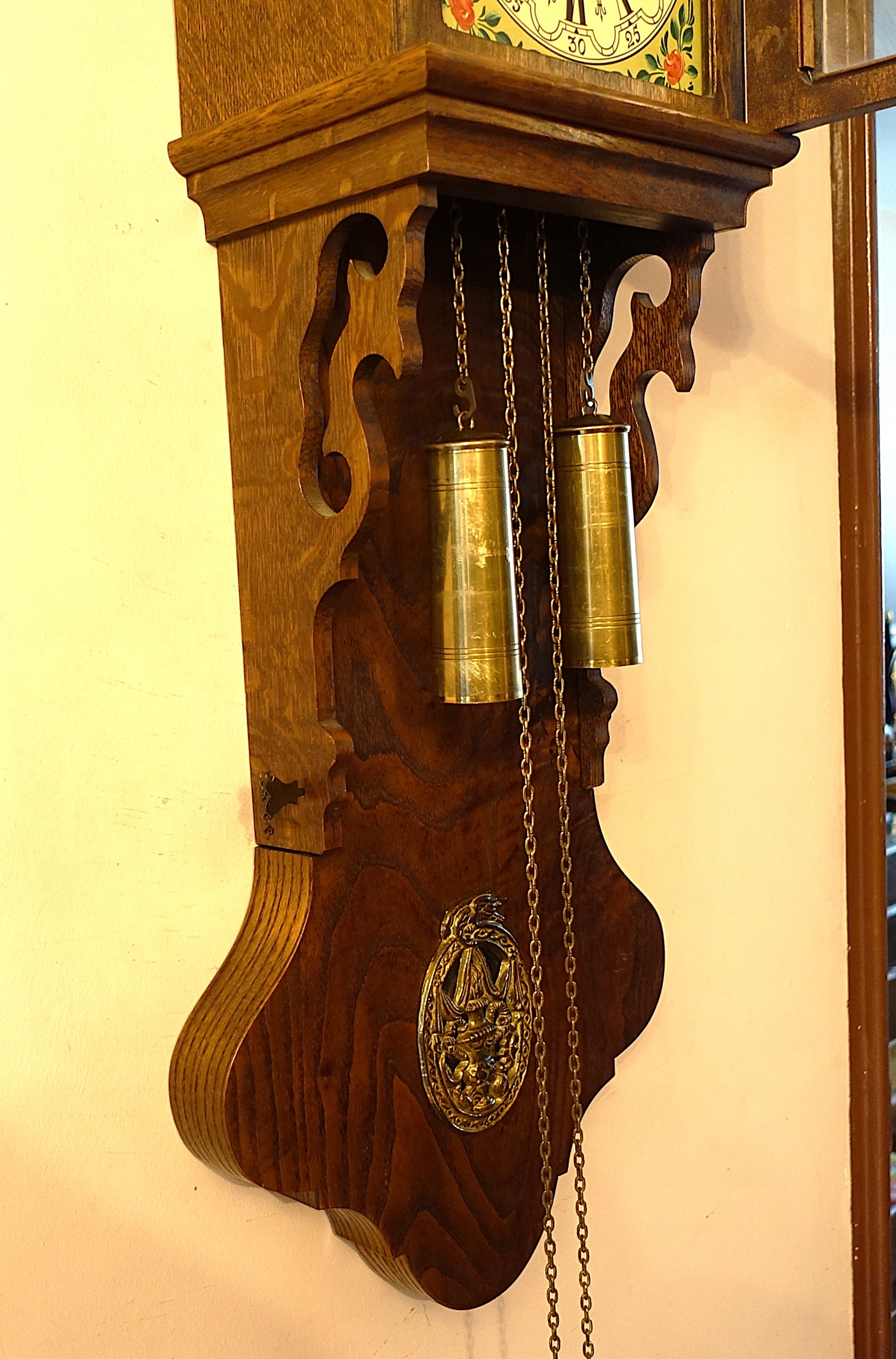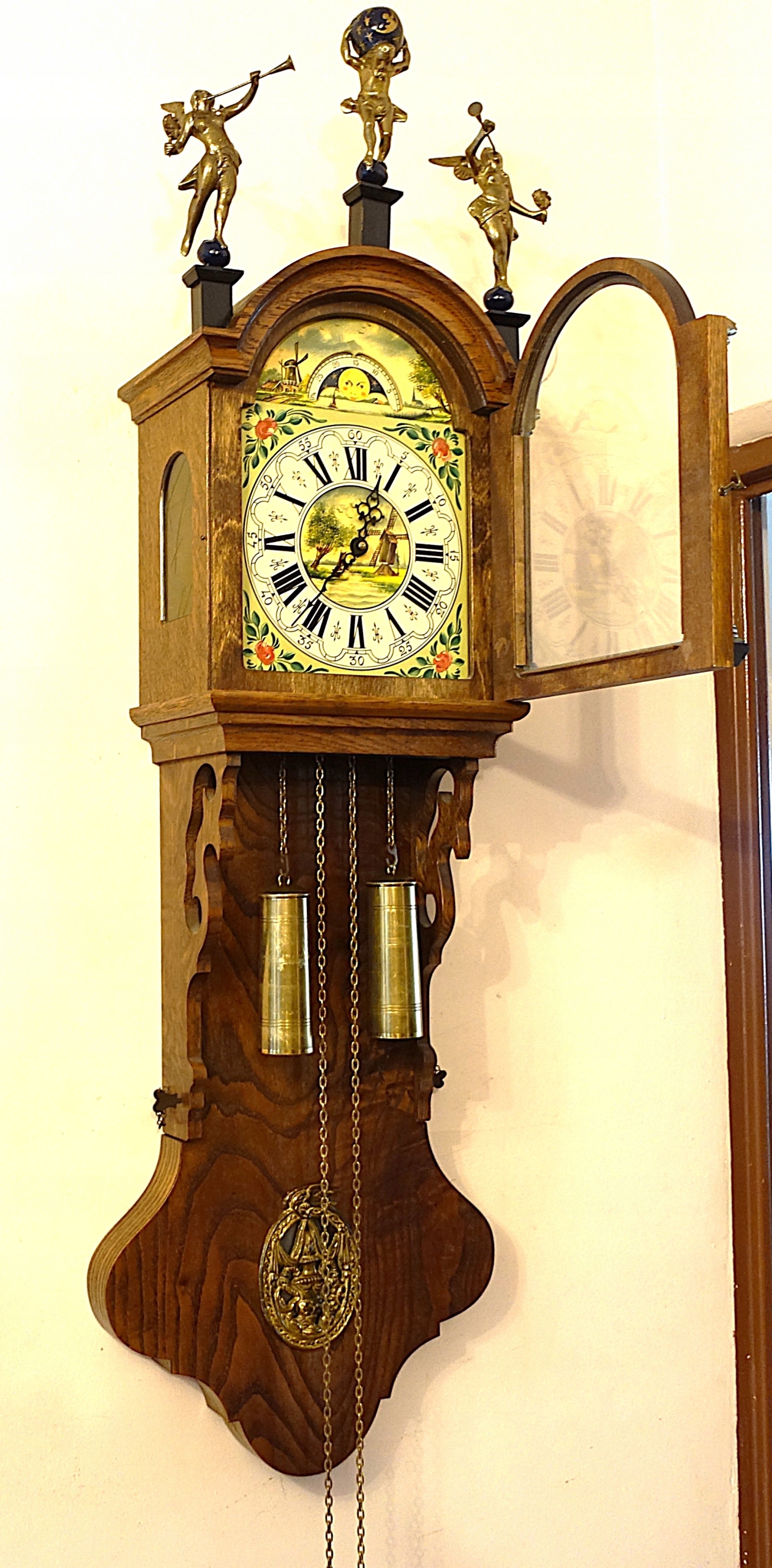 Щит расписан вручную, наверху латунные фигурки - фигурки двух трубачей и фигурка Атласа. Верхняя часть часов с дверцей съемная. Часы находятся в очень хорошем механическом и визуальном состоянии. Гонг отбивает полные и получасовые часы. Дополнительно указывают фазы Луны, механизм часов заводится за счет натяжения на весу.