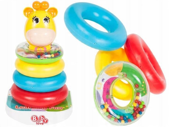 Башня-пирамида с кольцами для штабелирования. На вершине каждой пирамидки находится голова жирафа или плюшевого мишки.