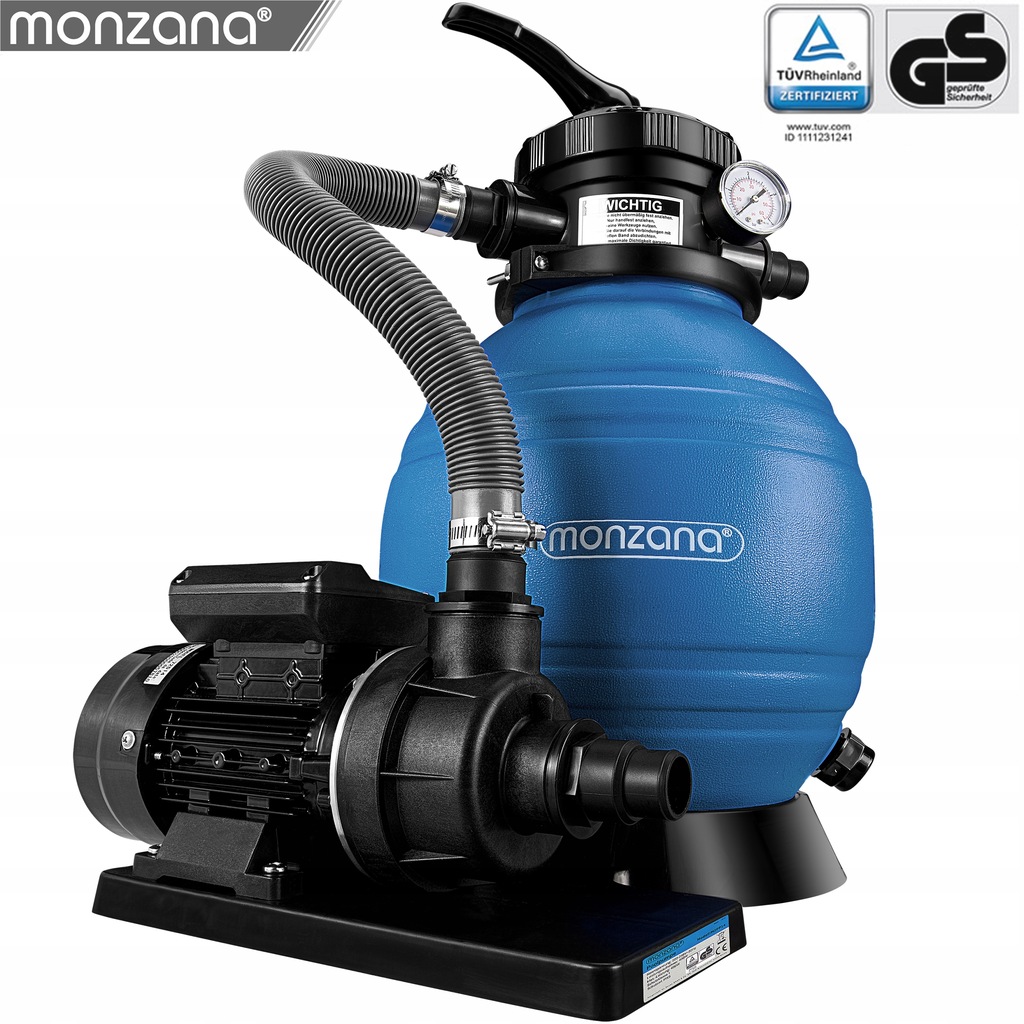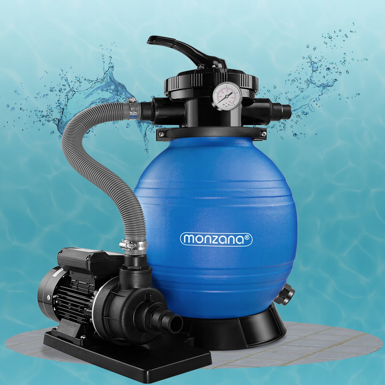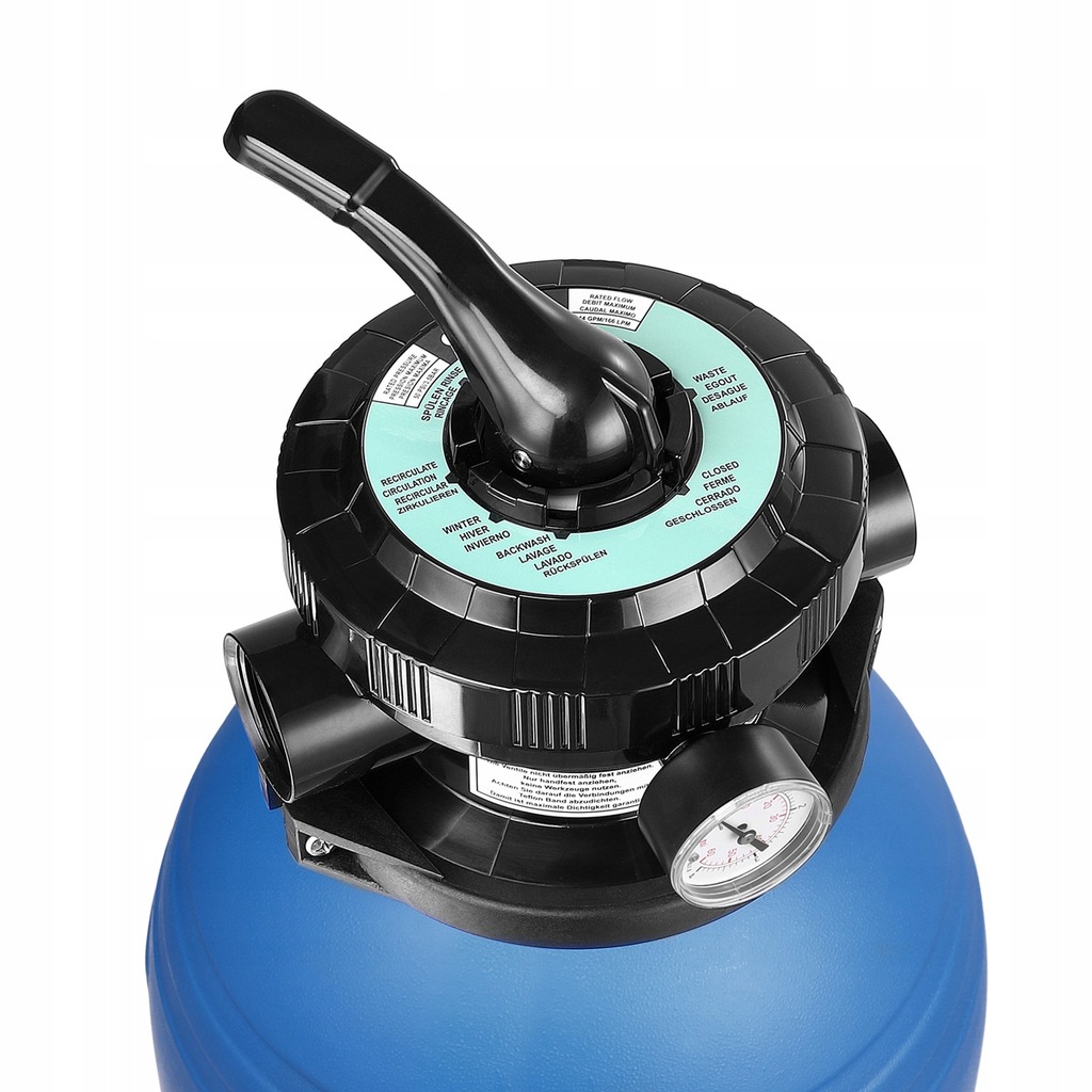 Комплект для фильтрации воды в бассейне состоит из насоса для бассейна и песочного фильтра с 7-ходовым клапаном, установленным сверху, и крыльчатым насосом.