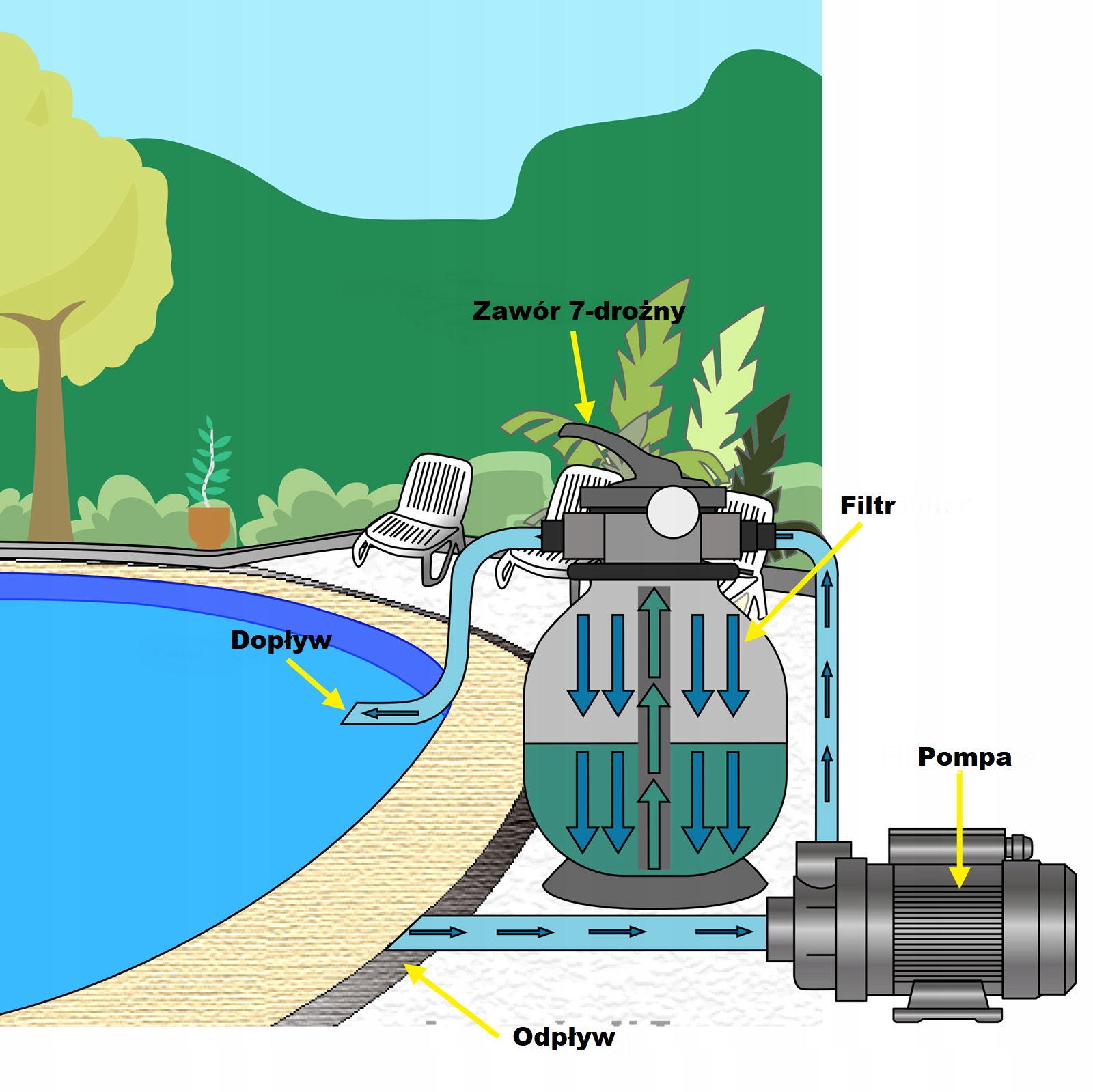 Комплект для фильтрации воды в бассейне состоит из насоса для бассейна и песочного фильтра с 7-ходовым клапаном, установленным сверху, и крыльчатым насосом.