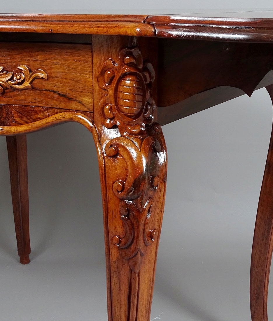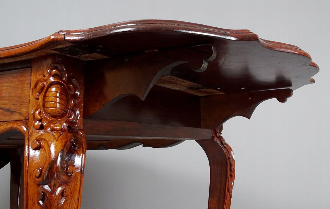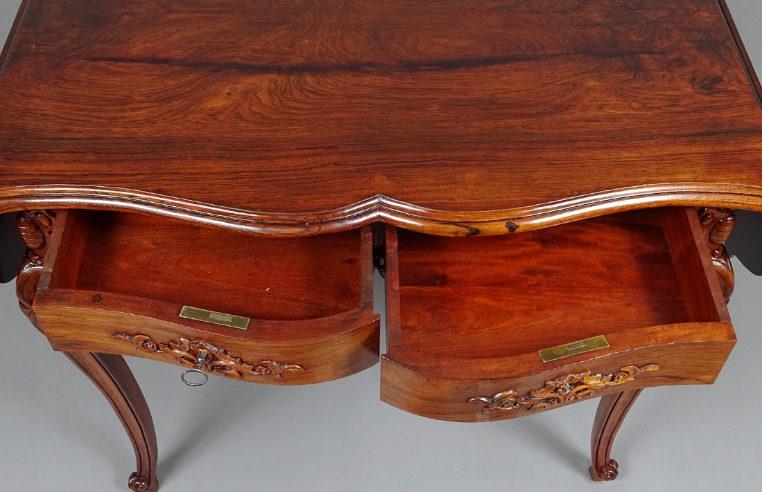 С основной столешницей с волнистой передней и задней частью, поддерживаемой четырьмя Столы-кабриоли с торцами изящных ножек, резных вверху в виде цветов. С обеих сторон расположены навесные столешницы с волнистой линией по краям, поддерживаемые с каждой стороны двумя деревянными опорами. В комоде два ящика с резьбой на гранях в виде усиков растений и цветов, со стальными накладными замками и ключом.