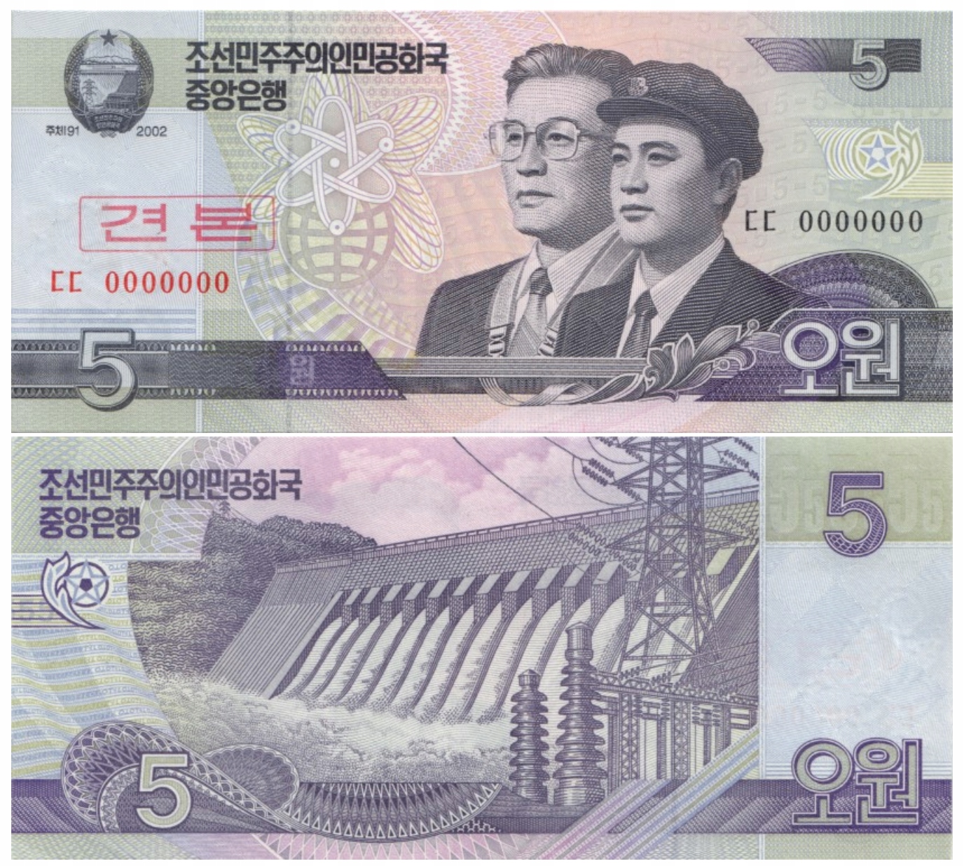 Северная Корея 5 выиграл 2002 г. P-58S Образец UNC