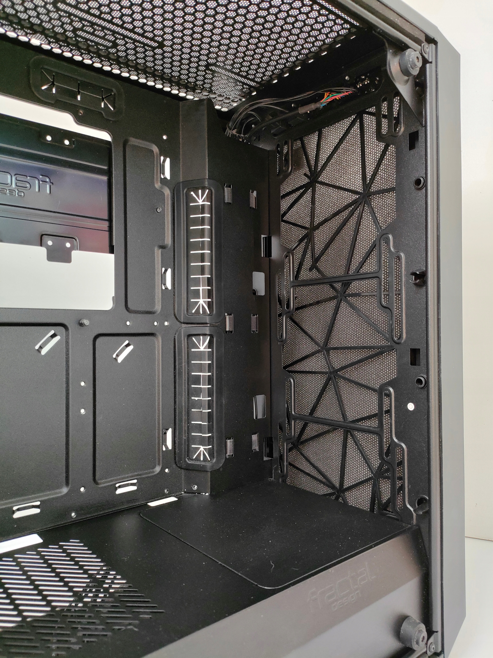 Фрактальный дизайн сместитель Визуально, фронт особенно отличается металлической сеткой, состоящей из асимметрично расположенных треугольников на основе поверхностей алмазов. Это создает уникальный 3D -эффект, который умело подчеркивает блестящую границу и логотип серебряного фрактального дизайна. Благодаря сетевым элементам сетки C, он знает, как удовлетворить хороший воздушный поток внутри корпуса, а также может вместить мощное игровое оборудование и большие двойные и тройные радиаторы.