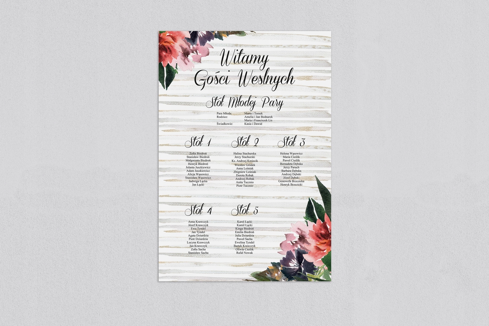 План свадебного стола Акварель - Мотив 3 в разных стилях. Твердый и тщательно сделанный. Он может легко разместить список всех гостей на вашей свадьбе. План таблицы может быть свободно персонализирован с помощью ваших собственных имен или любых надписей.