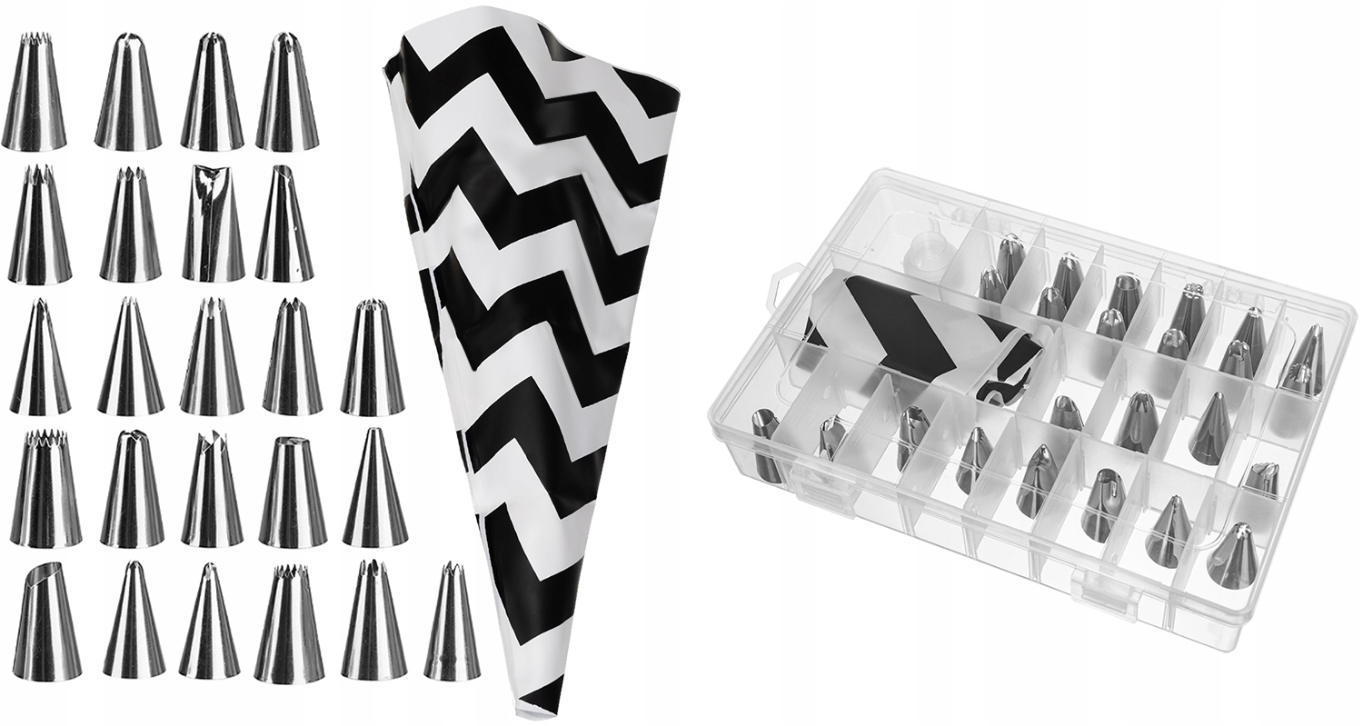 Кондитерский мешок с 24 декоративными насадками, которые можно хранить в прилагаемом органайзере.