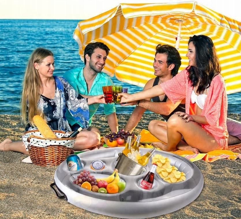 🧉 【Большая вместимость】Надувной контейнер для напитков имеет 5 круглых опор, 3 овальных держателя для закусок и 2 ручки для удобного извлечения и хранения.