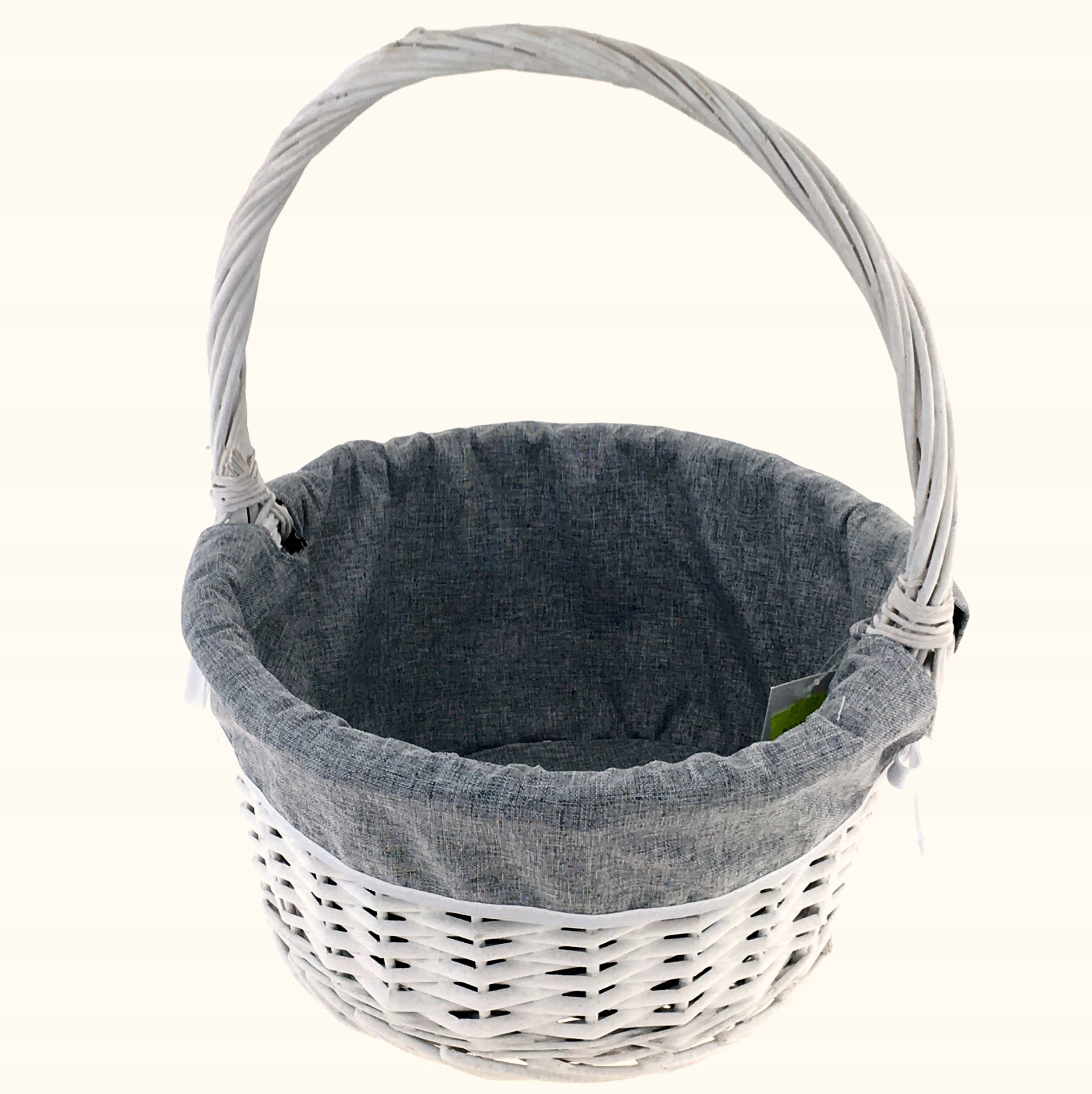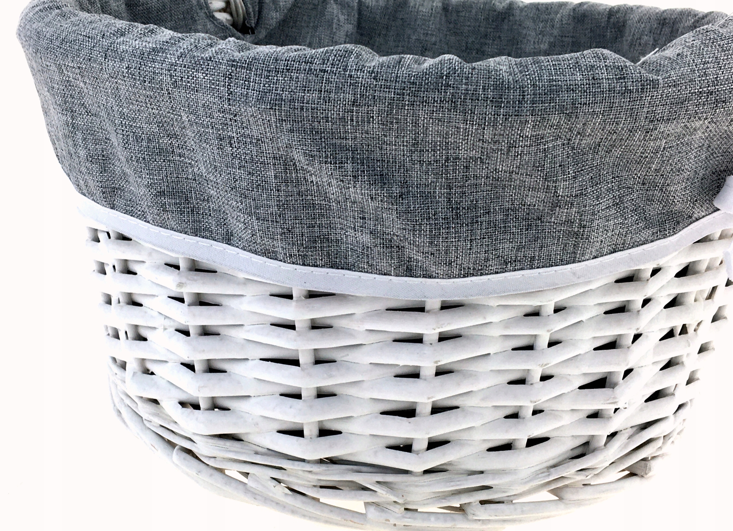 Элегантная, красиво сделанная белая плетеная корзина круглой формы, слегка сужающаяся к низу. Корзина облицована серой хлопковой вставкой, украшенной белой окантовкой. Вставка независима от корзины - легко снимается и моется.