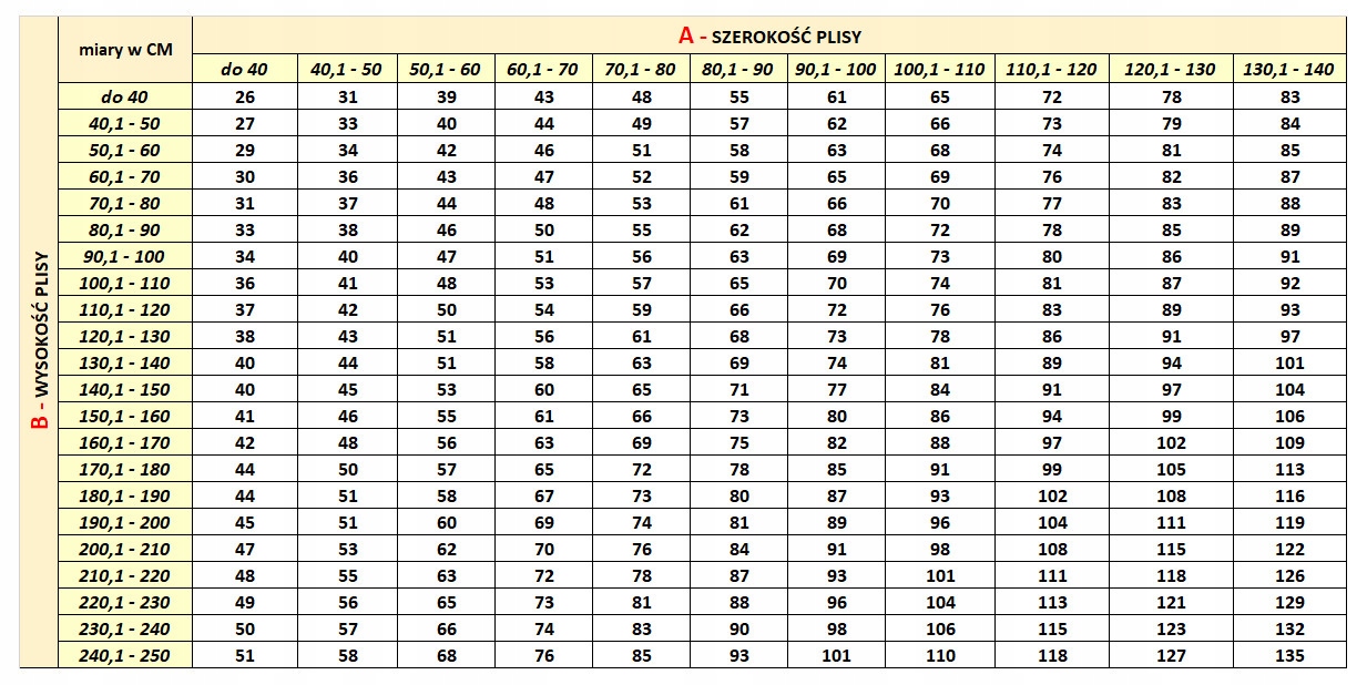 В представленной ниже таблице указано, сколько штук (единиц) необходимо приобрести для выбранного размера складок => вам просто нужно прочитать поле на пересечении ❗ширины A (по горизонтали) с ❗высотой B (по вертикали).< /h2>