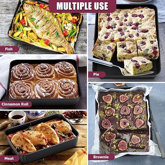 - МНОГОФУНКЦИОНАЛЬНОЕ ИСПОЛЬЗОВАНИЕ: Размеры 31,5 x 24,8 x 5 см. Набор из двух предметов — это удобный и универсальный инструмент, который подойдет во многих ситуациях на вашей кухне. Идеально подходит для выпечки прямоугольных тортов, пирогов, булочек, приготовления семейной пиццы, фокаччи, лазаньи и запеканок, жареного мяса и овощей. Это также хороший выбор для подачи еды.