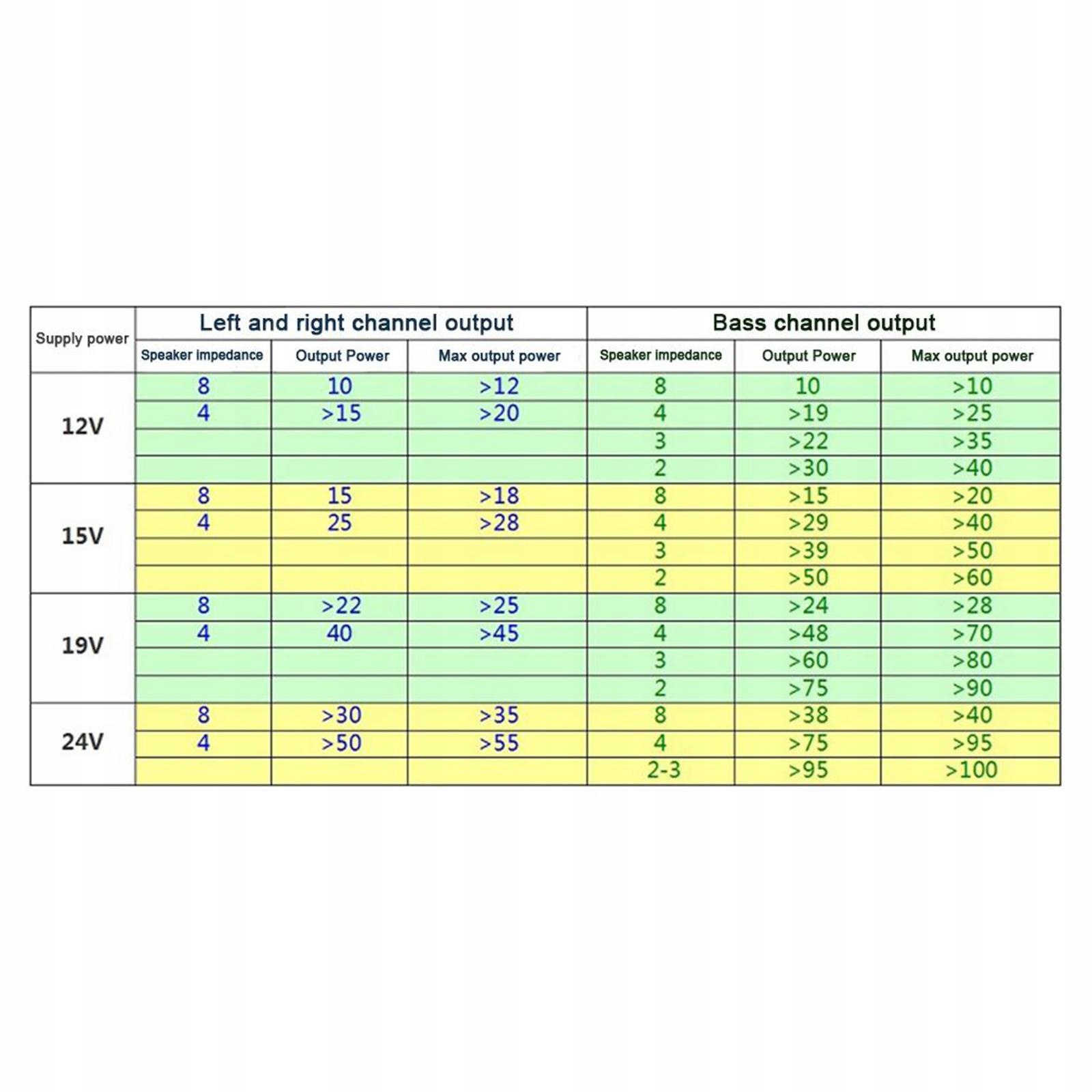 Используйте источник питания постоянного тока: 12-24 V источник питания, максимальная поддержка 50 Вт (левый канал) + 50 Вт (правый канал) + 100 Вт (басовый канал) Трехканальный выход.