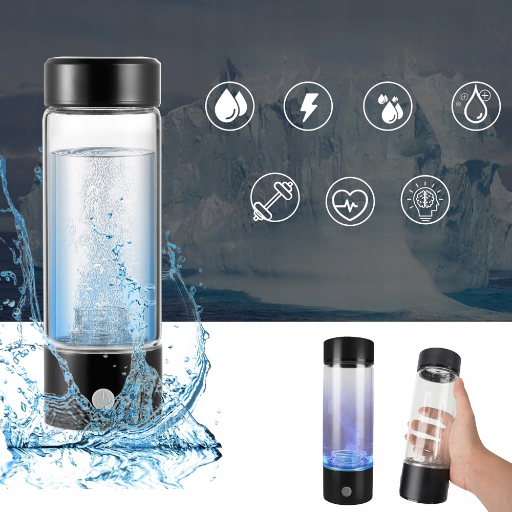 - Ей легко пользоваться, просто наполните бутылку водой, нажмите кнопку, загорится синий свет нижний включится, и водород начнет разлагаться.