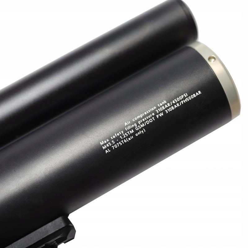 ✅ Карабин оснащен баком емкостью 255 куб.см и максимальным рабочим давлением 310 Бар и двумя манометрами. Карабин дополнительно оснащен регулятором, который регулируется снаружи. Мы можем понижать и повышать давление на регуляторе с заправленным картриджем до 310 Бар. Такая конструкция регулятора позволяет настроить оптимальные параметры для индивидуальной съемки. Когда мы хотим сделать больше выстрелов, мы снижаем давление на регулятор, но когда нам нужно больше энергии, нам нужно увеличить давление на регулятор.