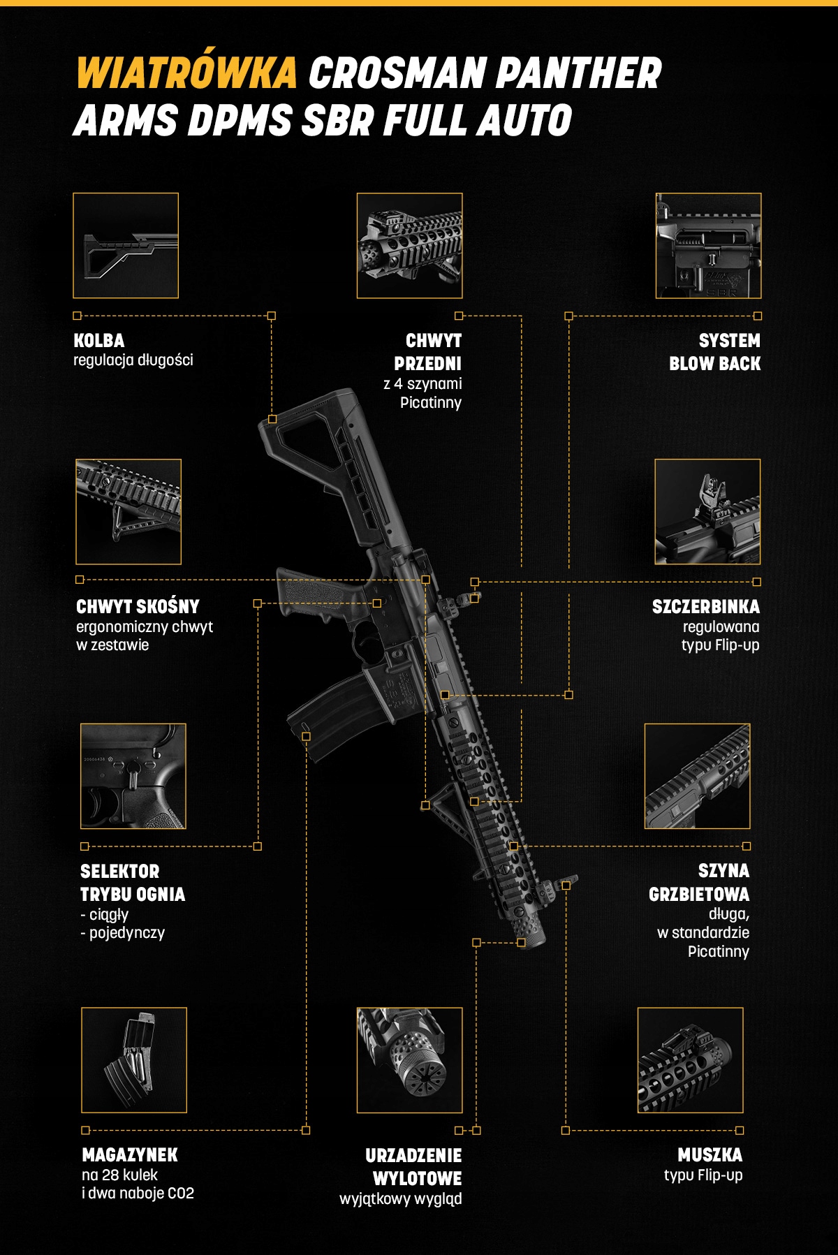 Пневматическое ружье с возможностью стрельбы очередями. DPMS создан по образцу винтовок семейства M4/M16 и изготовлен из легкого материала, дополнительно армированного стекловолокном.
