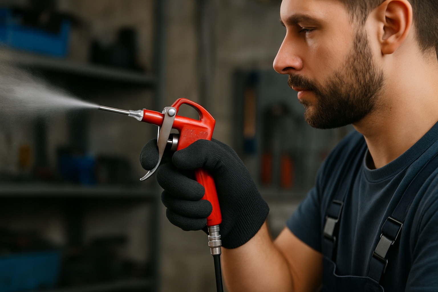 Пистолет -выдувки используется для очистки с помощью потока сжатого воздуха грязных поверхностей. Благодаря длинной сопло можно работать с пистолетом в тяжелых местах. Необходимо на каждом заводе и обслуживании.