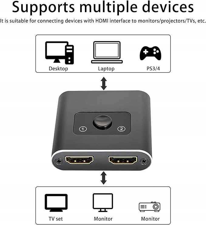 - 【Двустороннее переключение】Switch 2.0 поддерживает два режима переключения. Два входа и один выход: к одному монитору подключаются два устройства; Один вход и два выхода: одно устройство подключено к двум мониторам. Просто нажмите кнопку HDNI, чтобы быстро переключиться на другое рабочее устройство и решить проблему нехватки интерфейсов высокой четкости для ваших устройств.