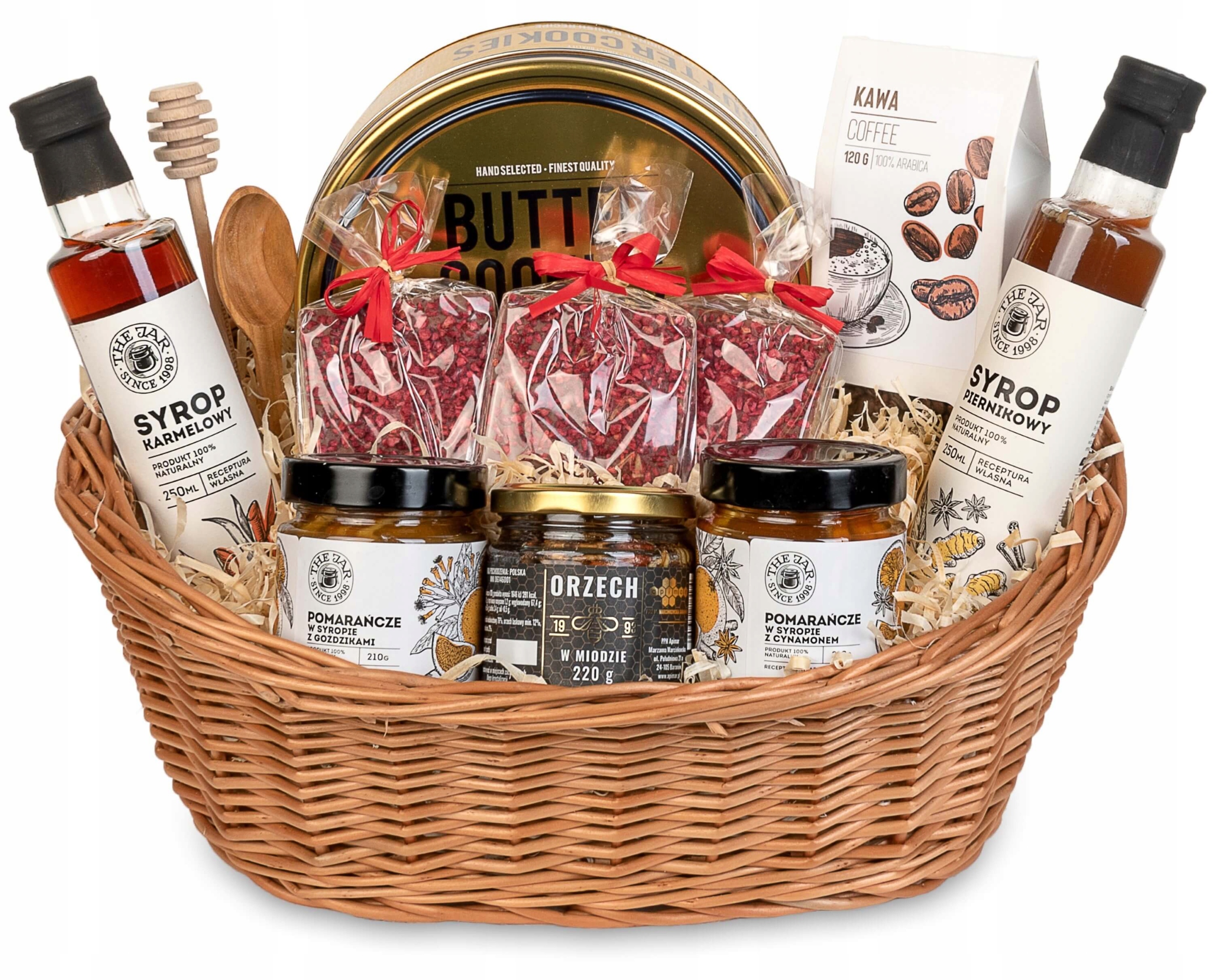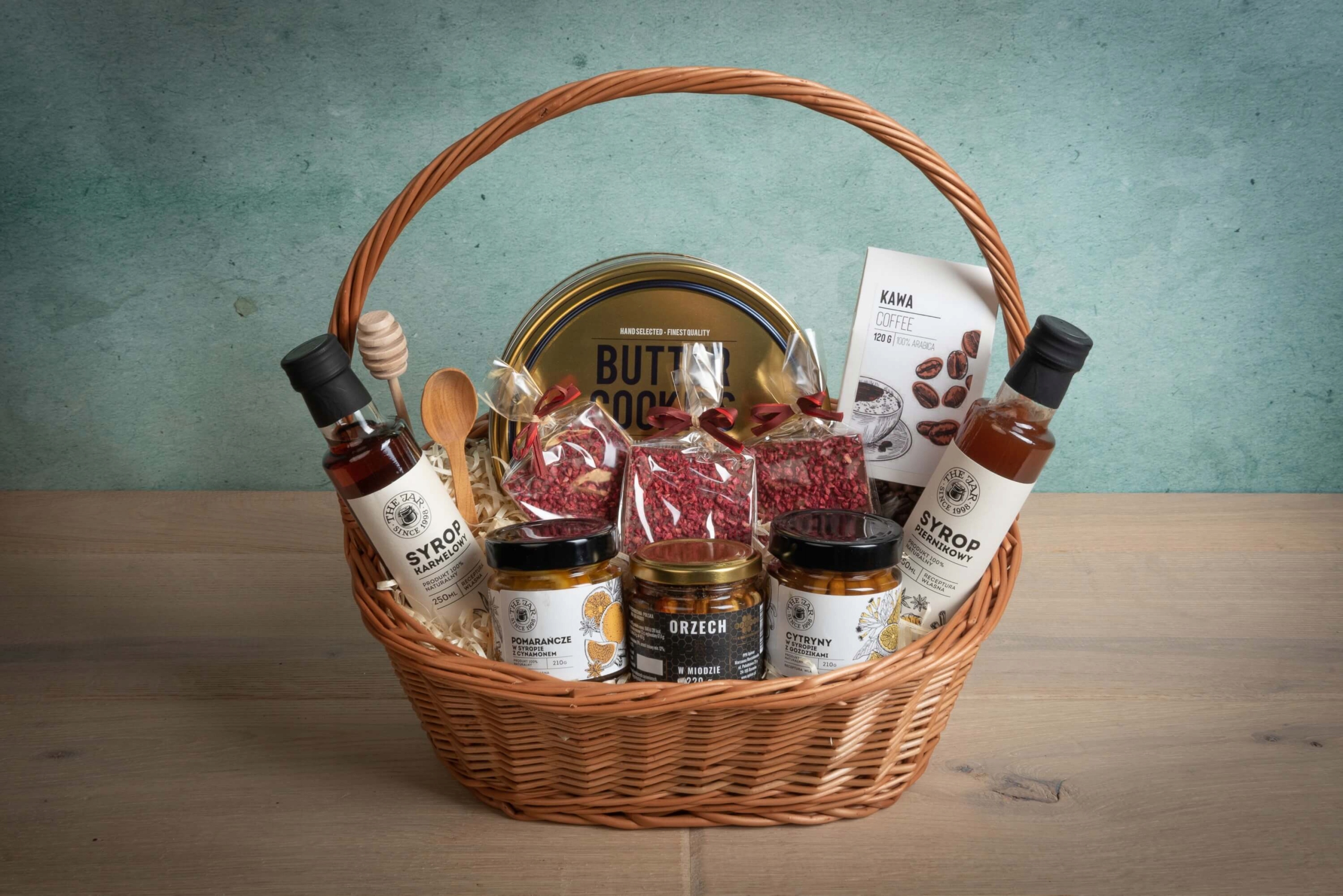 Эта элегантная плетеная корзина скрывает настоящие сокровища: от ароматического кофе до сладкого сиропа и печенья