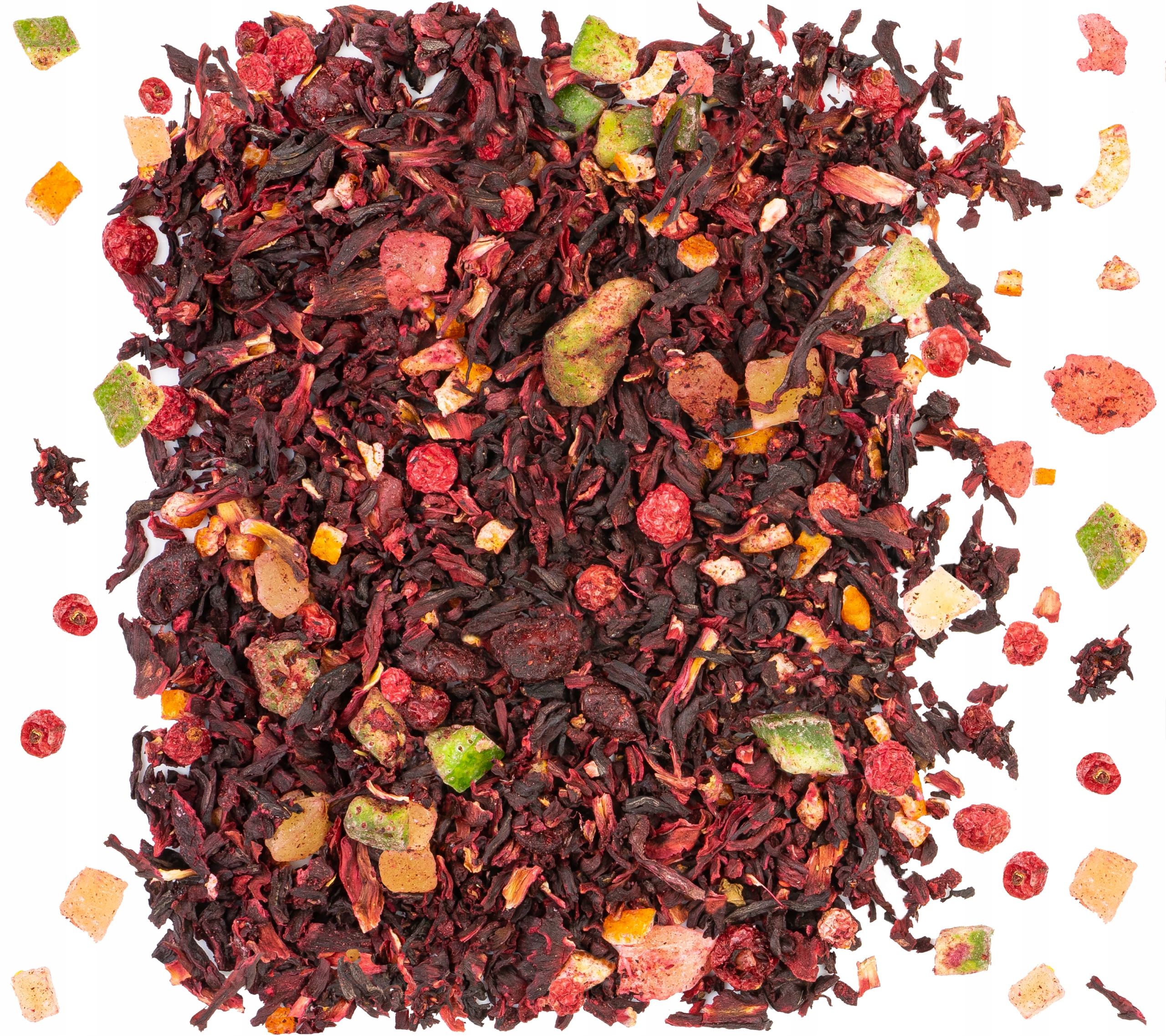 Ингредиенты: Гибискус, Помело засахаренные (Pomelo Peel 53,39% Сахар 44,59%, Регулятор кислотности: лимонная кислота, консервант: пирозиарн натрия, красители (E102, E133)), сухофкюра, конфеты. (Ананас, сахар, консервант SO2,), манго (манго, сахар, регулятор кислотности - лимонная кислота), дыня. (дыня, сахар, регулятор кислотности - лимонная кислота), Candy Orange. (Pom., Сахар, глюкозовый сироп, регулятор кислотности E330, консервант E202, аромат), красная смородина, аромат.