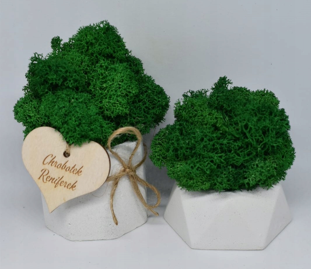 Размеры 1 горшка: (5см х 5см х 5см, размеры горшка без мха - ок. 5-6см мха) Размеры 2 горшков: 7см х 9 см изготовлены из зеленого цвета высочайшего качества, цвет: бутылочно-зеленый (одноцветный), плотный и естественно пропитанный финский олений мох. Вазон ручной работы из архитектурного бетона.