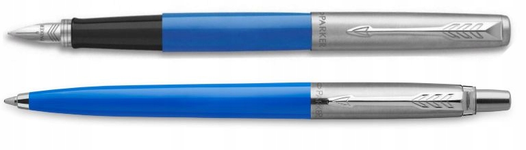 Ручка Blue Jotter: колпачок и зажим изготовлены из полированной нержавеющей стали. Передняя часть ручки изготовлена из белого пластика, перо — из стали.