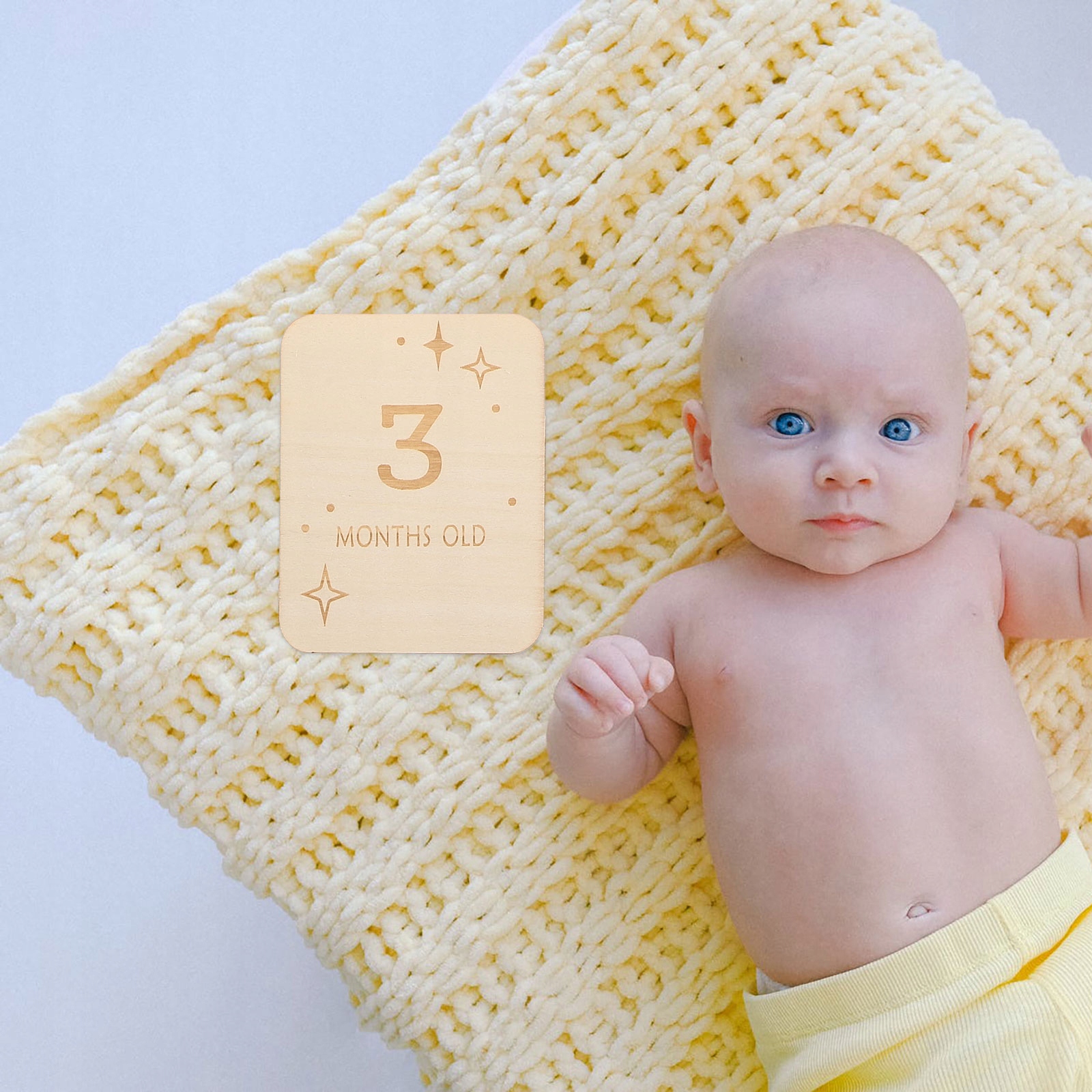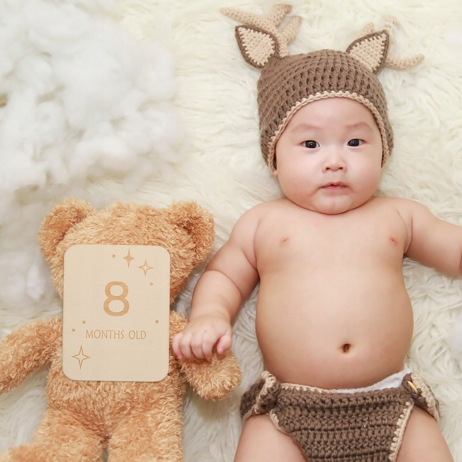 Карточки с вехами станут хорошим дополнением к вашей детской фотографии и покажут на фотографии месяц вашего ребенка.