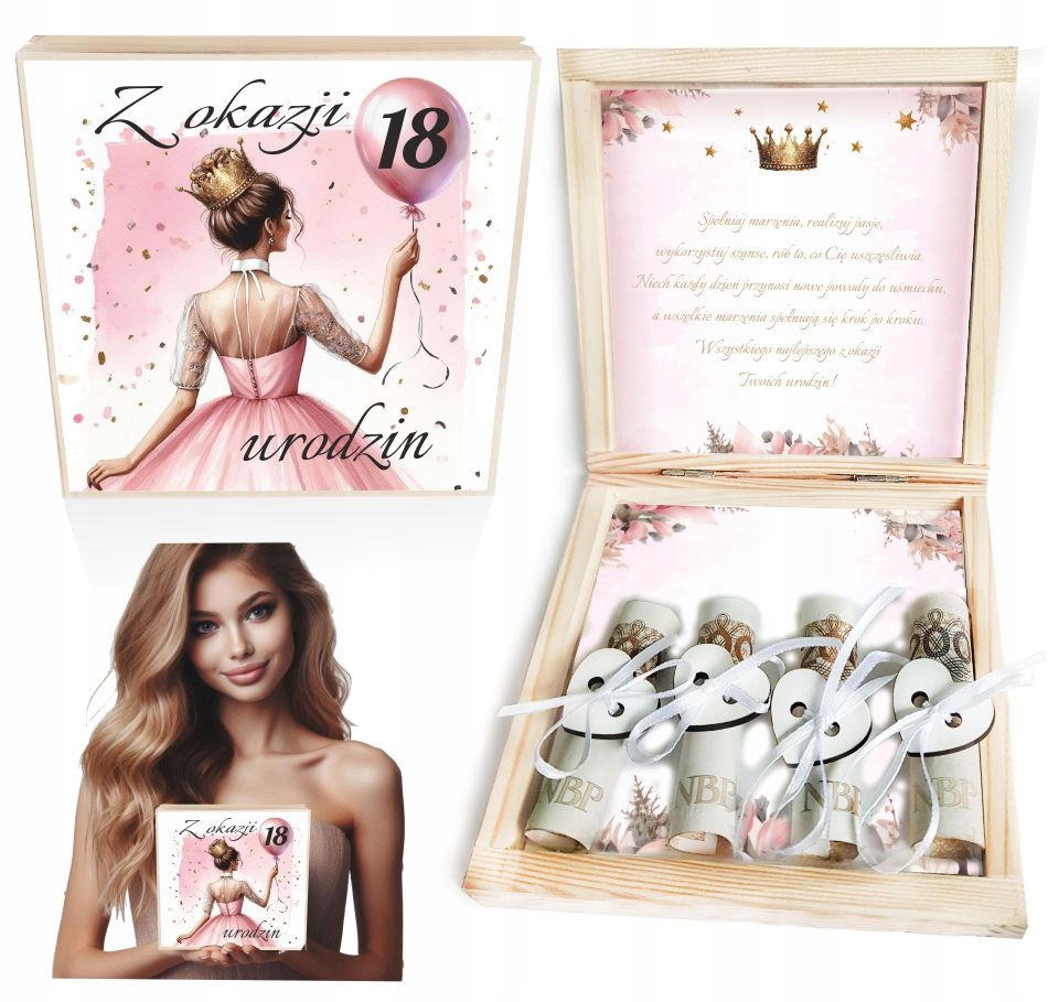 За пределами коробки есть печать с золотой восемнадцатью. Наклейка посвящения украшает внутреннюю часть коробки. Кроме того, внутри есть 4 белых сердца с лентой, чтобы связать банкноты.