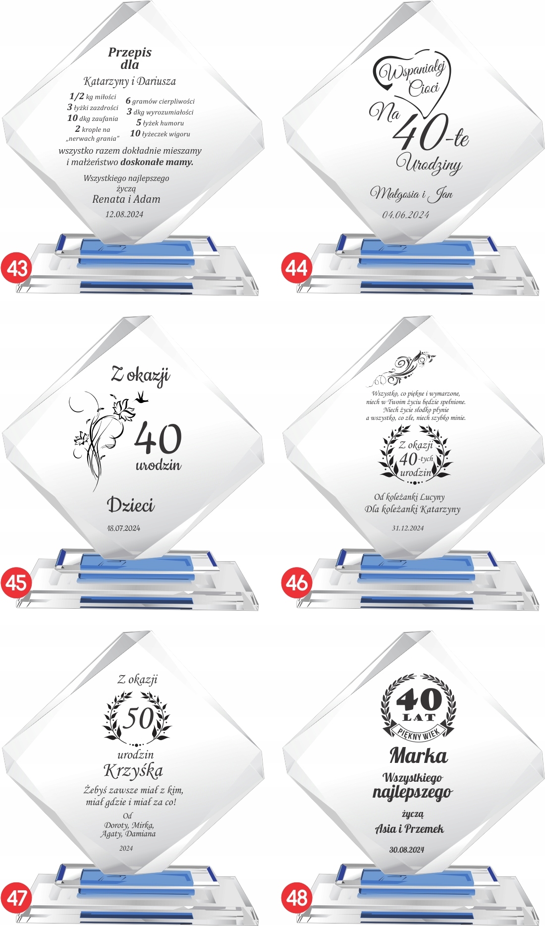 Гравюра с сердцем - посвящение, которое останется навсегда - добавив посвящение нашей статуте, вы создаете подарок, который становится еще более личным и незабываемым. Наш опыт в области гравюры позволит вам передать свои мысли таким образом, что каждый получатель будет оценен. Независимо от этого случая, посвящение сделает дар уникальным сувениром годами. Представленная Statuette может быть подготовлена для вас для любого случая (свадьба, свадьба, крещение, причастие, день рождения, восемнадцать, день имени, юбилей, годовщина свадьбы, День матери и отца, дедушка и День бабушки, День святого Валентина, День учителя, отставка и т. Д.). Если вы не найдете интересный вам шаблон (шаблоны, доступные внизу страницы), вы всегда можете написать нам свой собственный текст, который мы выгравируем.