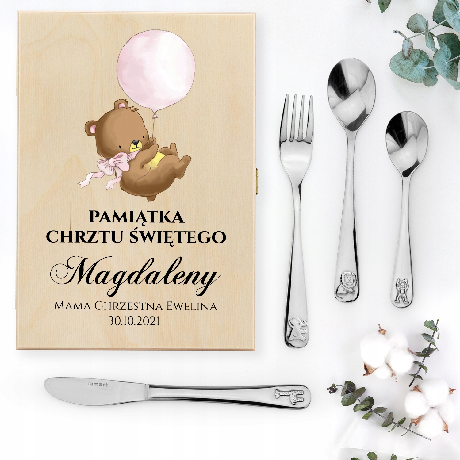 Ищете уникальный подарок своему крестнику или крестнице по случаю Святого Крещения или первого дня рождения, который прослужит ему долгие годы? Если да, то мы можем предложить вам уникальный набор столовых приборов, упакованный в деревянную коробку, а также сделаем на коробке персонализированную красочную печать. На каждом столовом приборе будет индивидуальная гравировка.