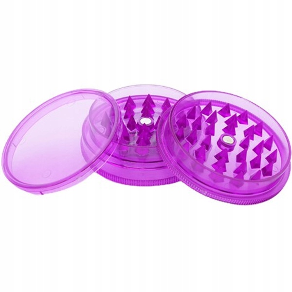 - Пластиковая, прозрачная мельница для табака, состоящая из трех частей.