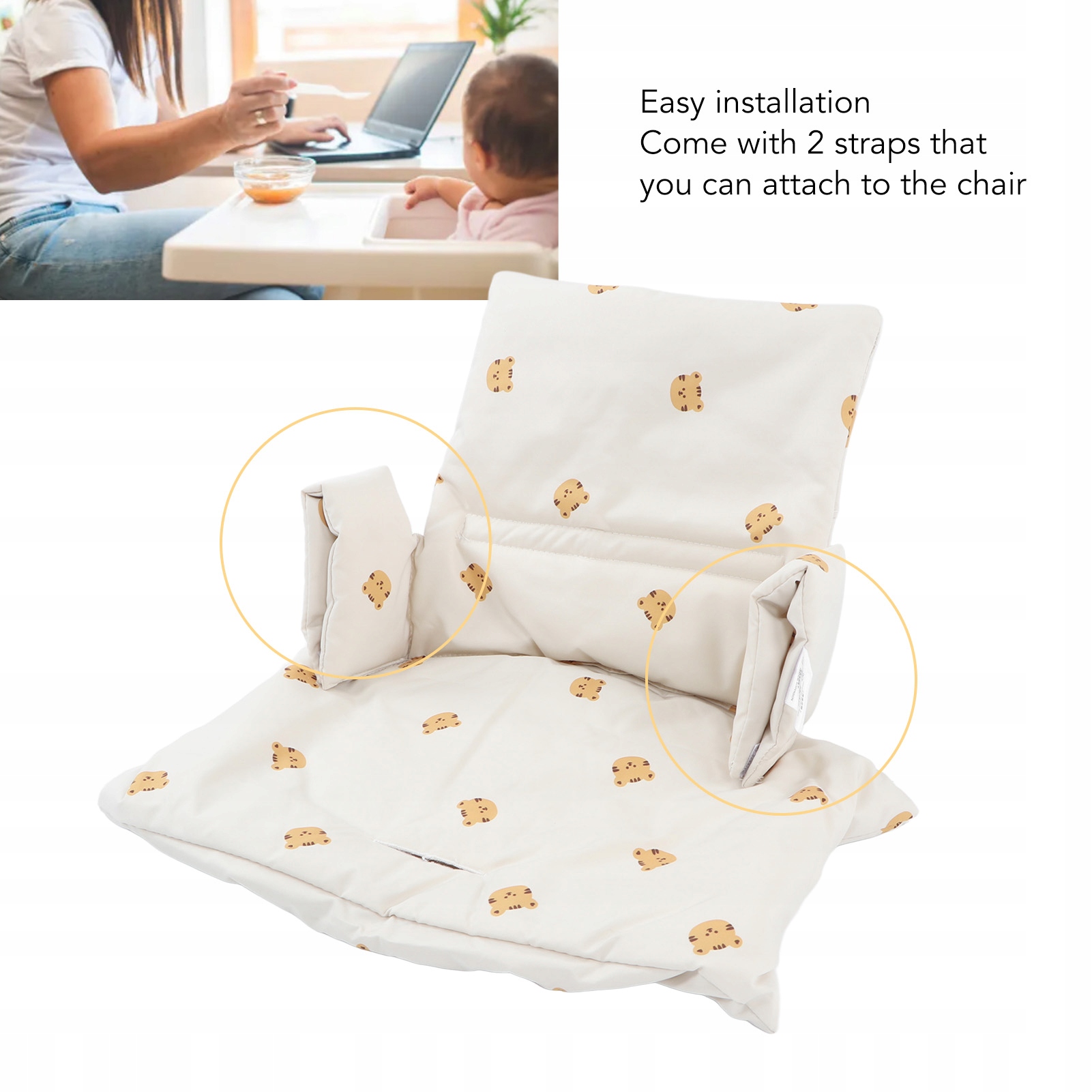 2. Легко установить: подушка для стула может быть связана с креслом, чтобы обеспечить безопасность для детей. Благодаря двум мягким ремням, это может быть безопасно прикреплено к каждому стулу.