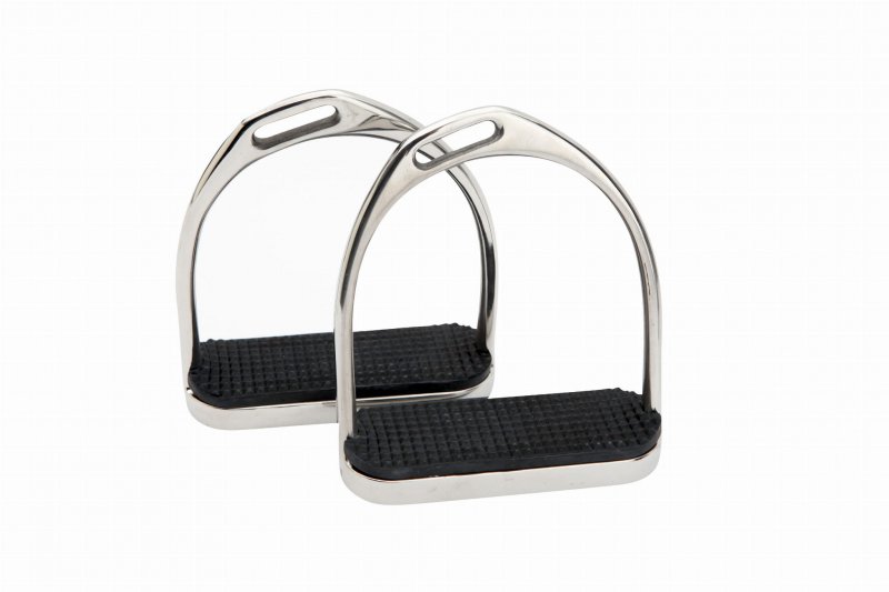 Асимметричные стремена — профилированные с двойным смещением x2. Отверстие для стремян в рычаге стремени, смещенном в сторону, помогает расположить ногу под углом к боковому рычагу стремени лошади, наклоненному по отношению к ножка-стремя - помогает опускать пятку. Изготовлена из нержавеющей стали. 1 пара В комплекте с резиновыми вставками - противоскользящие