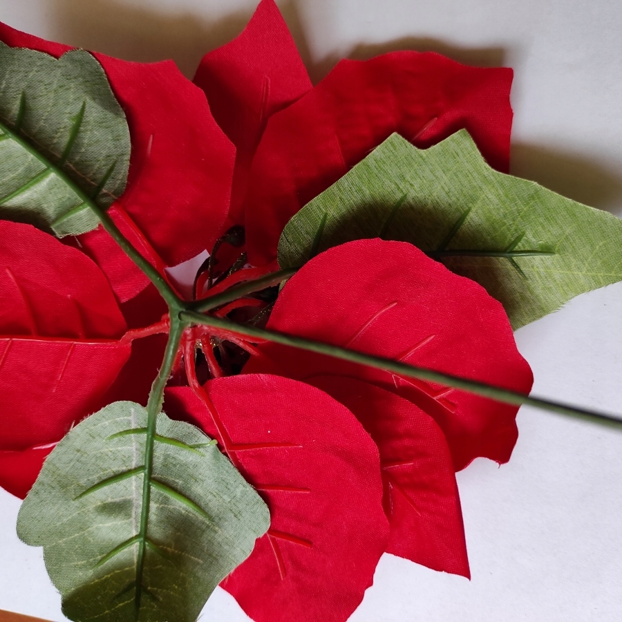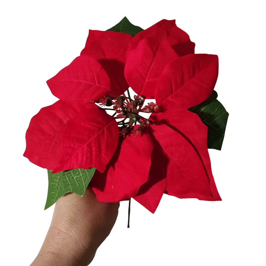 - Красивая, бархатистая пуансеттия прекрасно смотрится в букете искусственных и живых цветов.