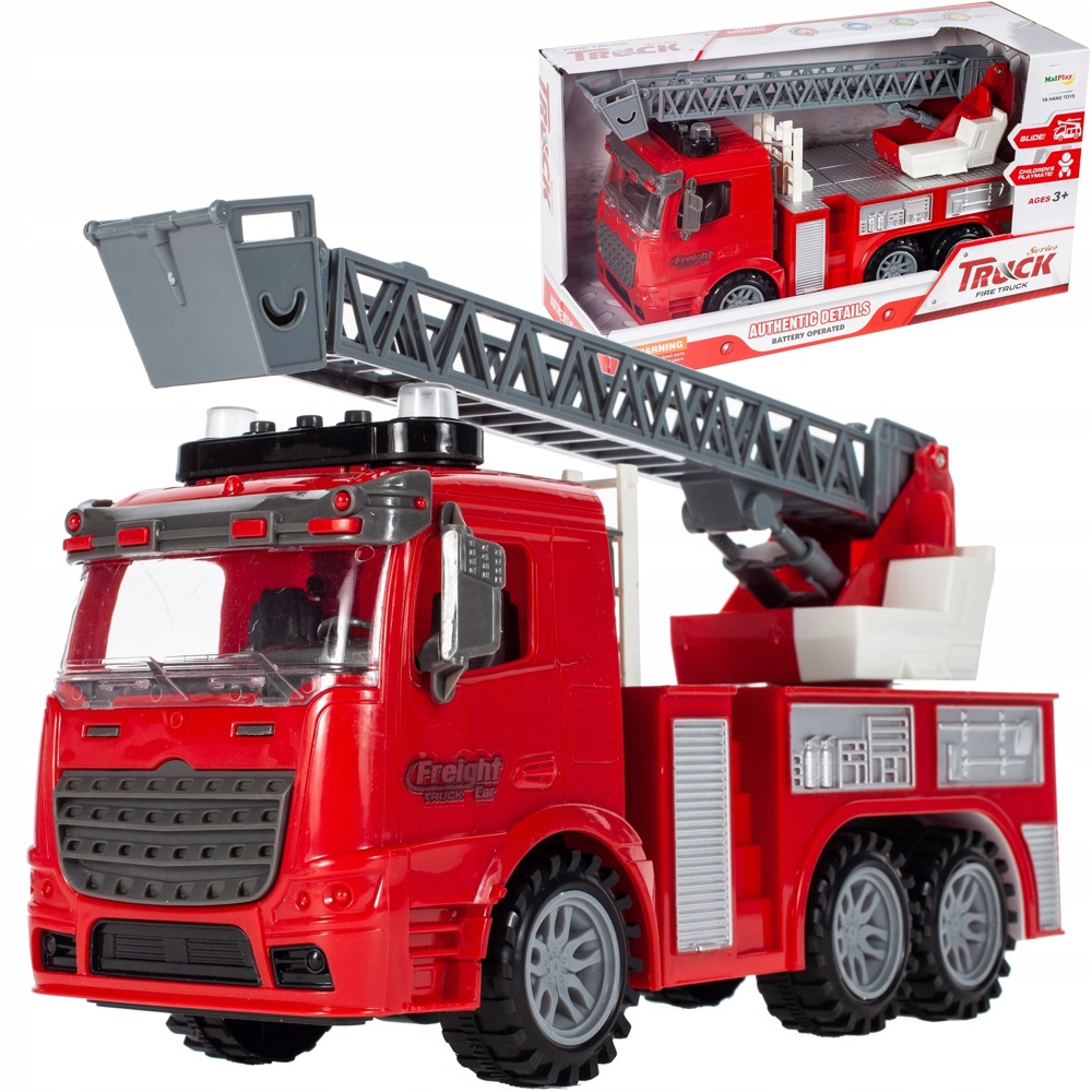 Красная пожарная машина с выдвижной вращающейся лестницей с корзиной и подвижными колесами с приводом - просто поставьте машину на пол, подтолкните ее вперед и позвольте машине двигаться вперед самостоятельно ! В верхней части кабины автомобиля расположены три кнопки.