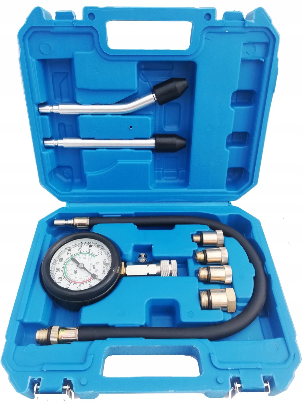Тестер для проверки давления сжатия в цилиндрах бензиновых двигателей с оборудованием, расширяющим его возможности. В пластиковом корпусе находится манометр с клапаном, прямой и изогнутый удлинитель, удлинитель напорного шланга и 4 переходника для подключения к баллонам. Детали оснащены быстроразъёмными соединениями для лёгкой и быстрой установки.