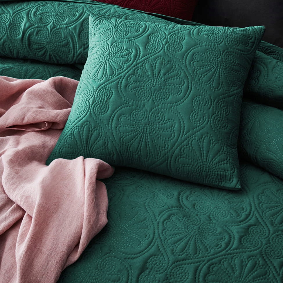 Темно-зеленое покрывало Leila. Эстетика коллекции тонко перетекает между стилями, отличающимися вневременностью и возвышенностью дизайн. Ажурно стеганые детали создают красивый орнаментальный узор, изящно оживляющий однотонный интерьер. Гладкая, матовая ткань покрывала, декорированная кантом, сочетает в себе гармонию и комфорт, создавая уютное пространство, в котором можно хорошо отдохнуть. . Покрывало обладает огромным потенциалом оформления и содержит богатую цветовую гамму – от спокойных цветов с оттенком тепла до глубоких, выразительных тонов.