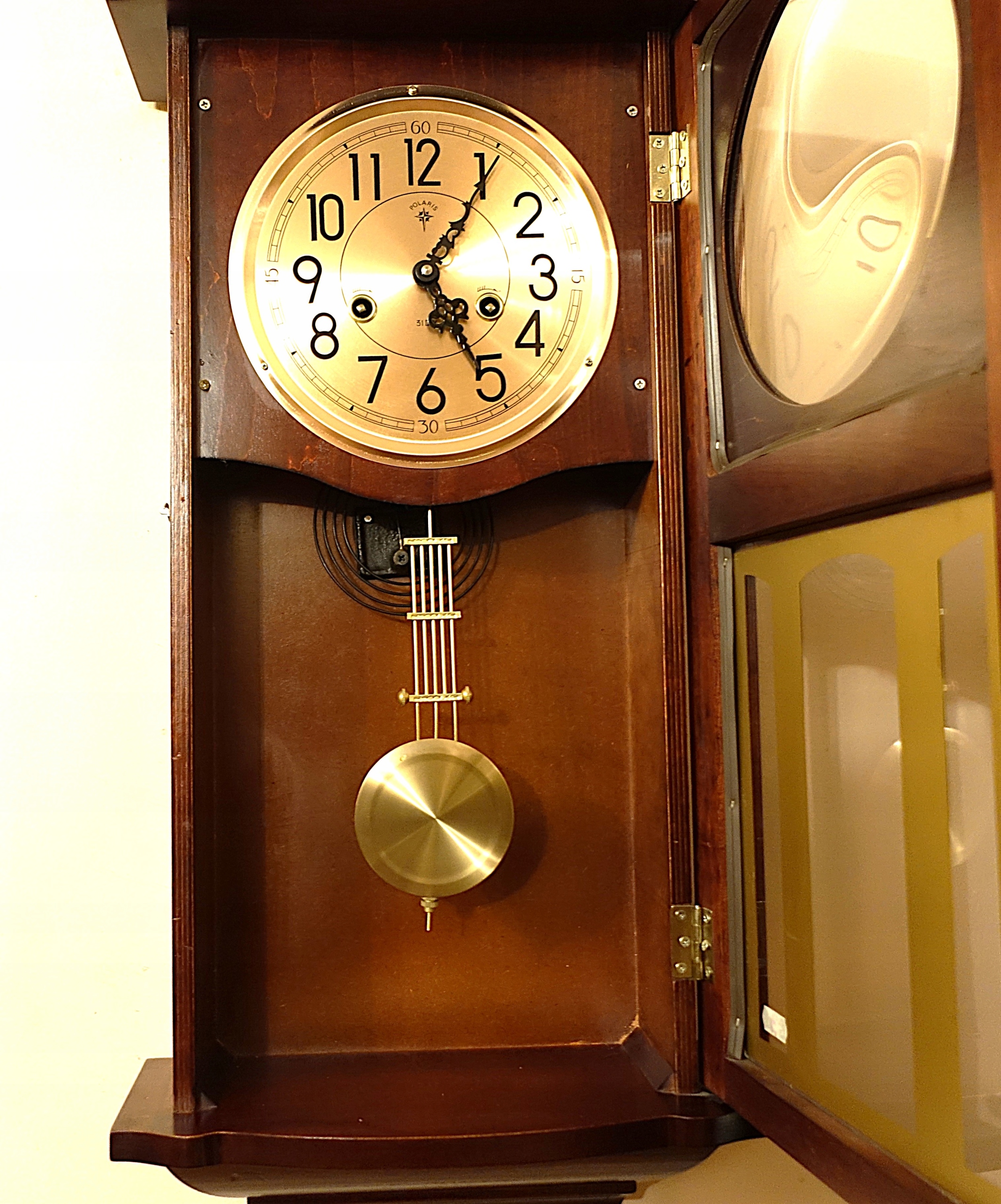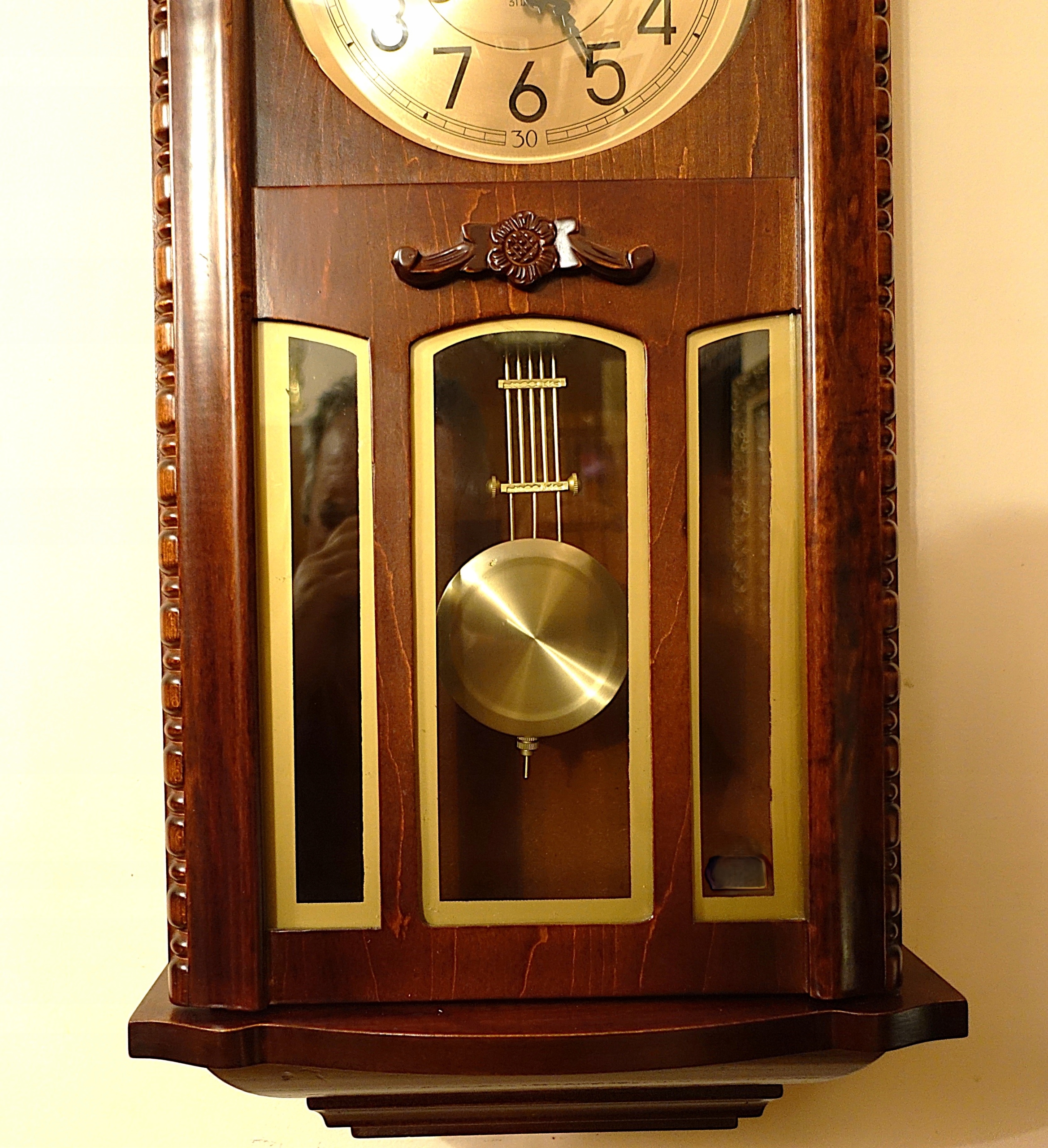 Стильные настенные часы известного и уважаемого бренда, в красивом футляре. Механизм часов работает исправно и очень точно. Механизм часов отбивает полные часы на спиральном гонге, очень приятно. звук, приятный для слуха.